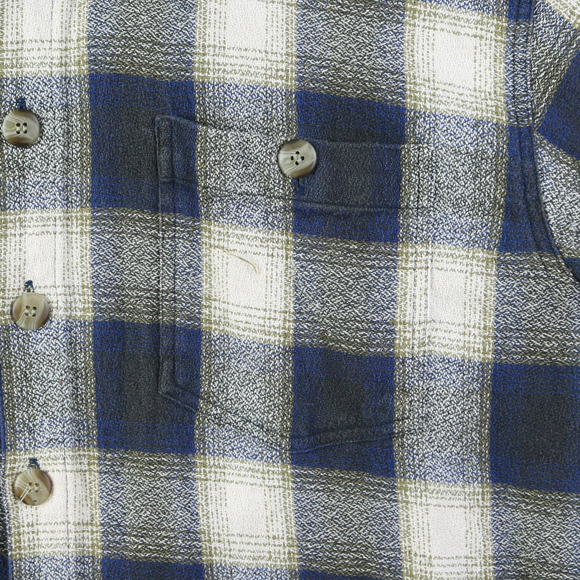 Vintage Cavenline Flannel Shirt in Blue. Button front placket, pointed collar, chest pocket, brushed plaid fabric. Visible wear and some subtle discoloration mark its vintage appeal.
