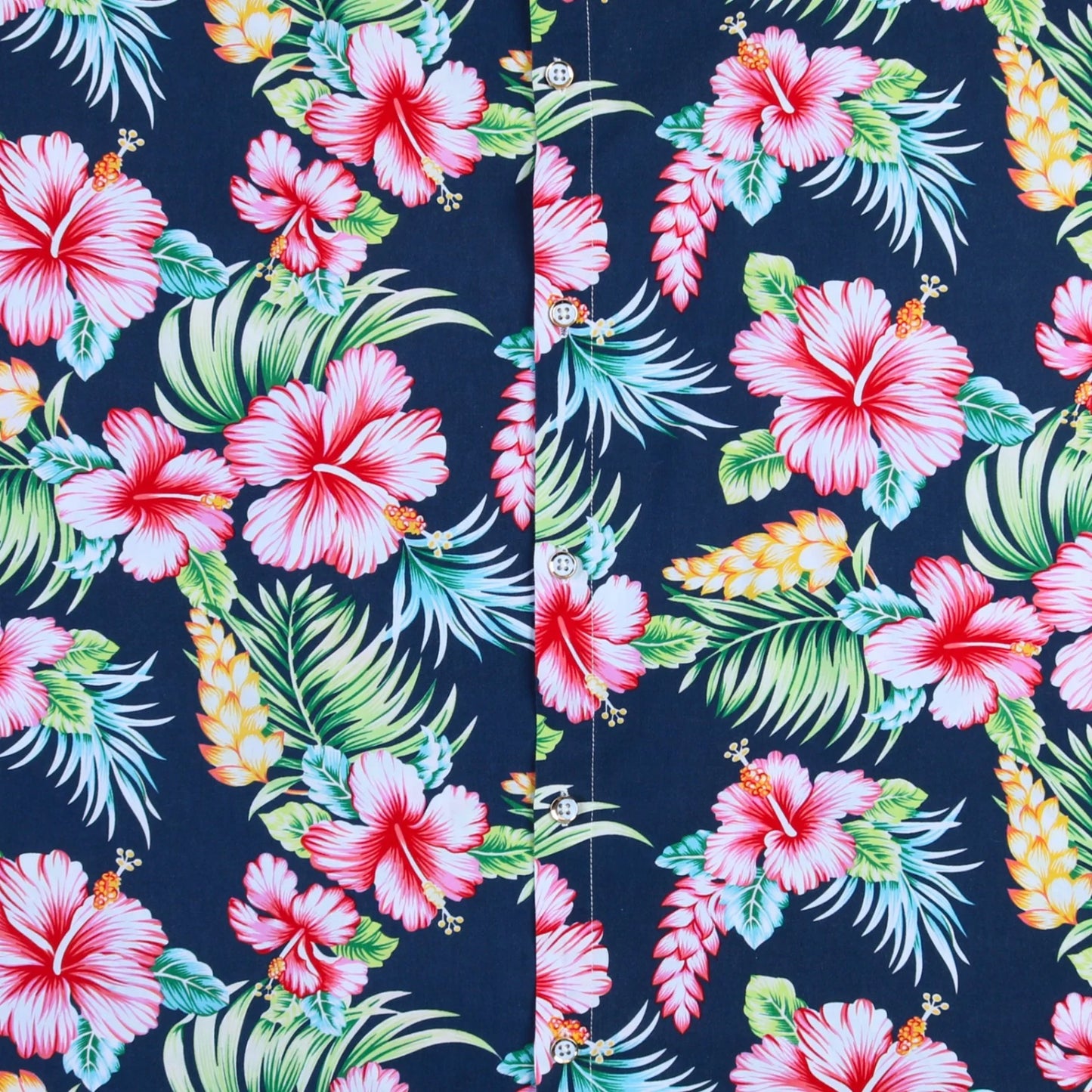 Vintage Hawaiian Aloha Shirts Shirt in navy. Made from lightweight fabric, this shirt features a button-down front and traditional collar, with a vivid floral design in pink, green, and yellow hues.