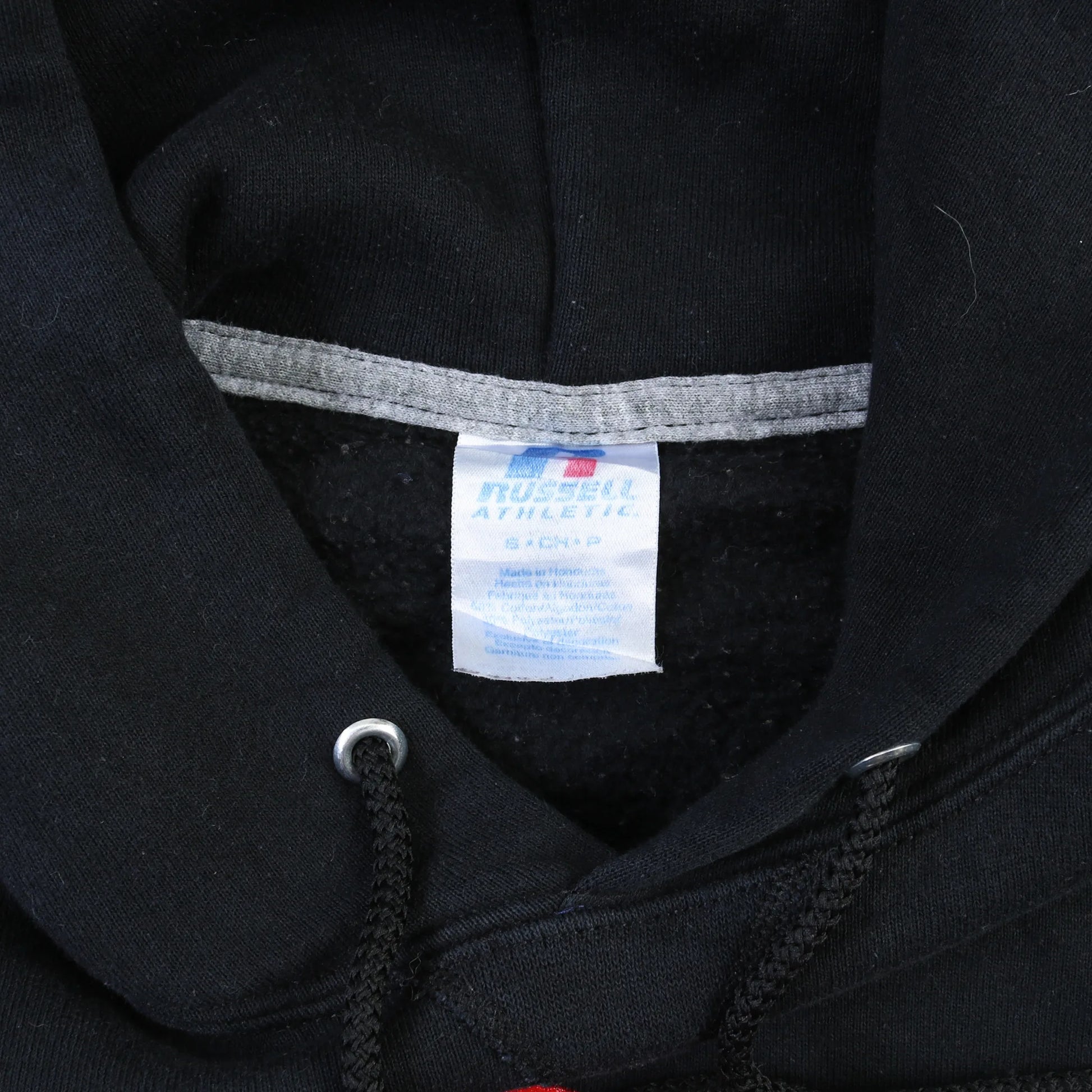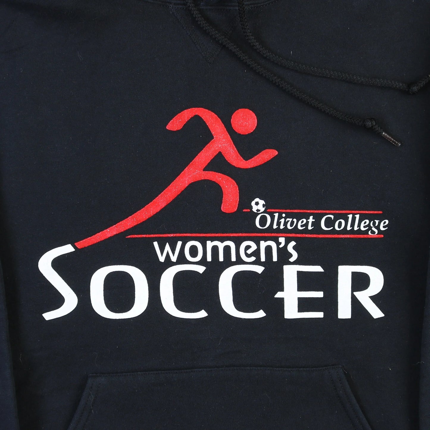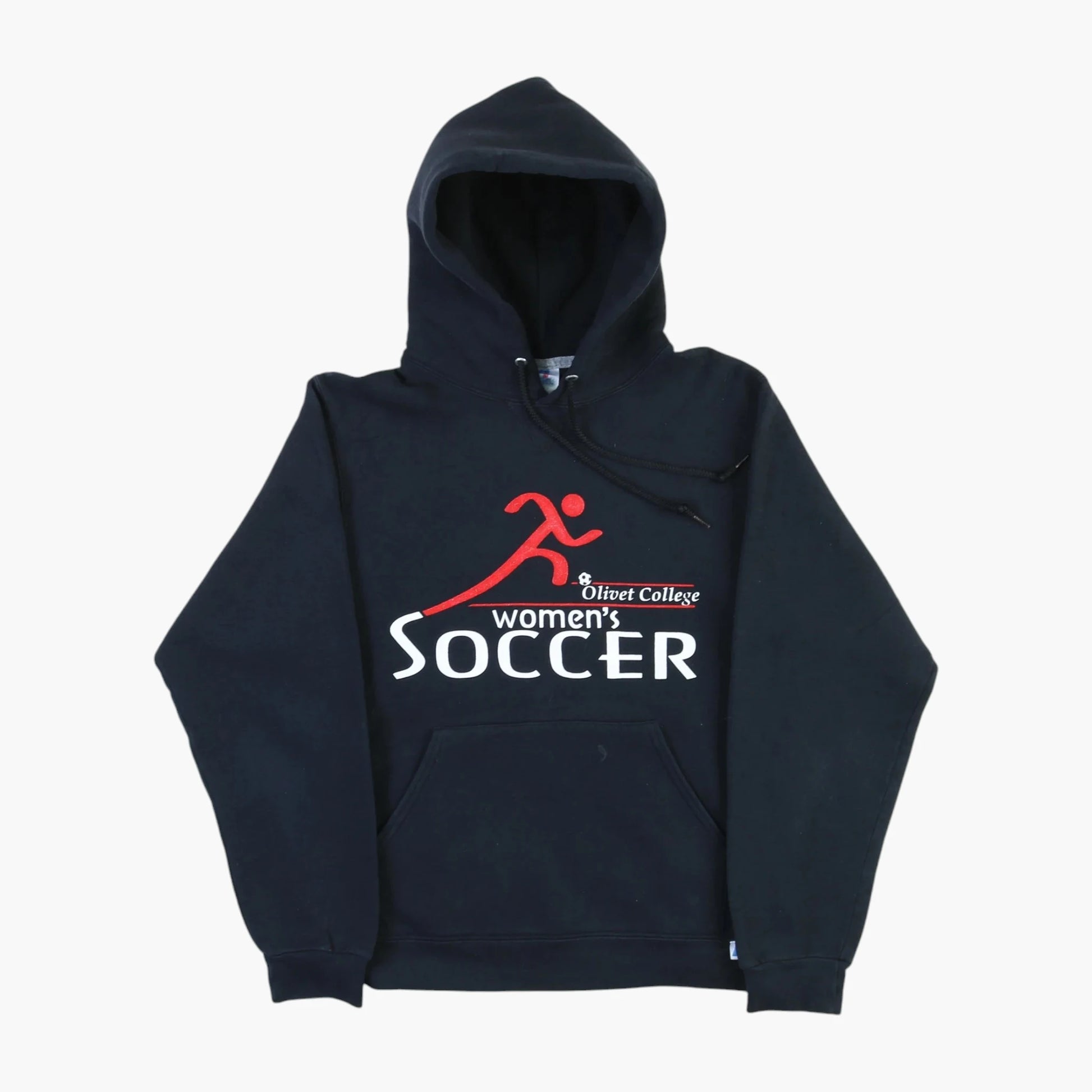 Vintage Russell Athletic Hoodie in Black. Black hoodie with a red and white 'Olivet College Women's Soccer' print, drawstring hood, ribbed cuffs and hem, logo detail at hem, and original Russell Athletic tag.