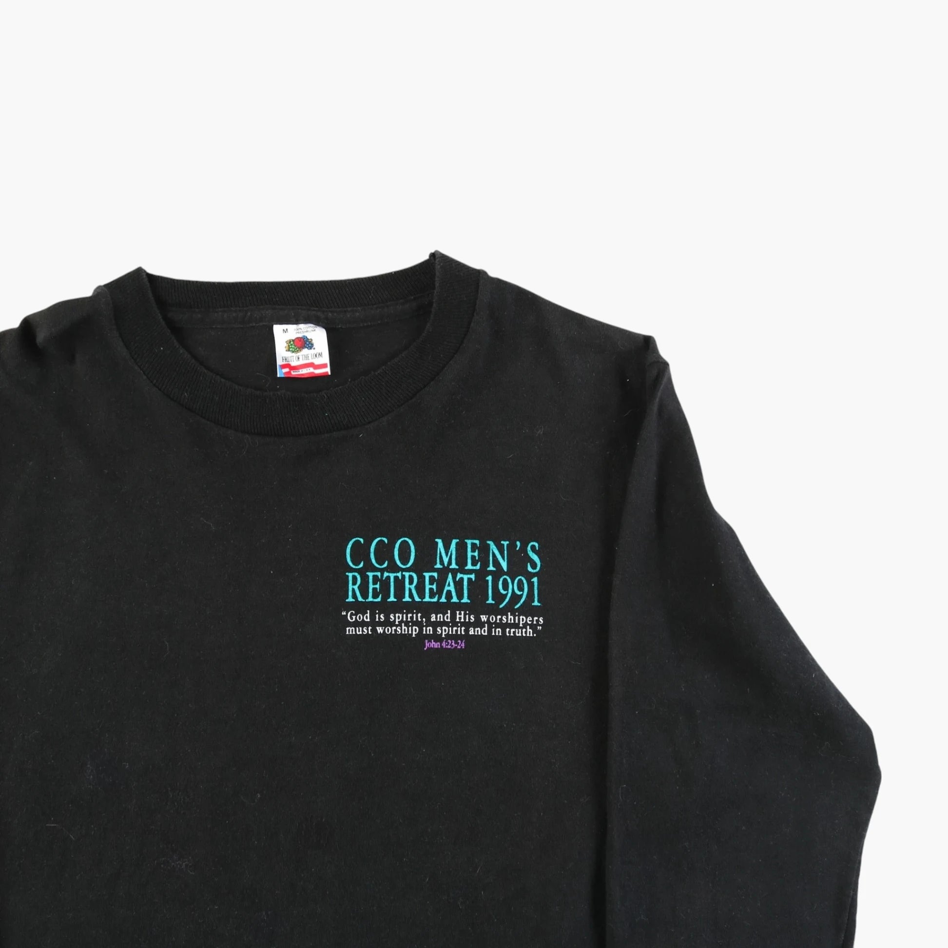 Vintage Vintage T-Shirts Sweatshirt in Black. Black crewneck sweatshirt with printed event text from 'CCO Men's Retreat 1991.' Features colorful back design and teal text on front.