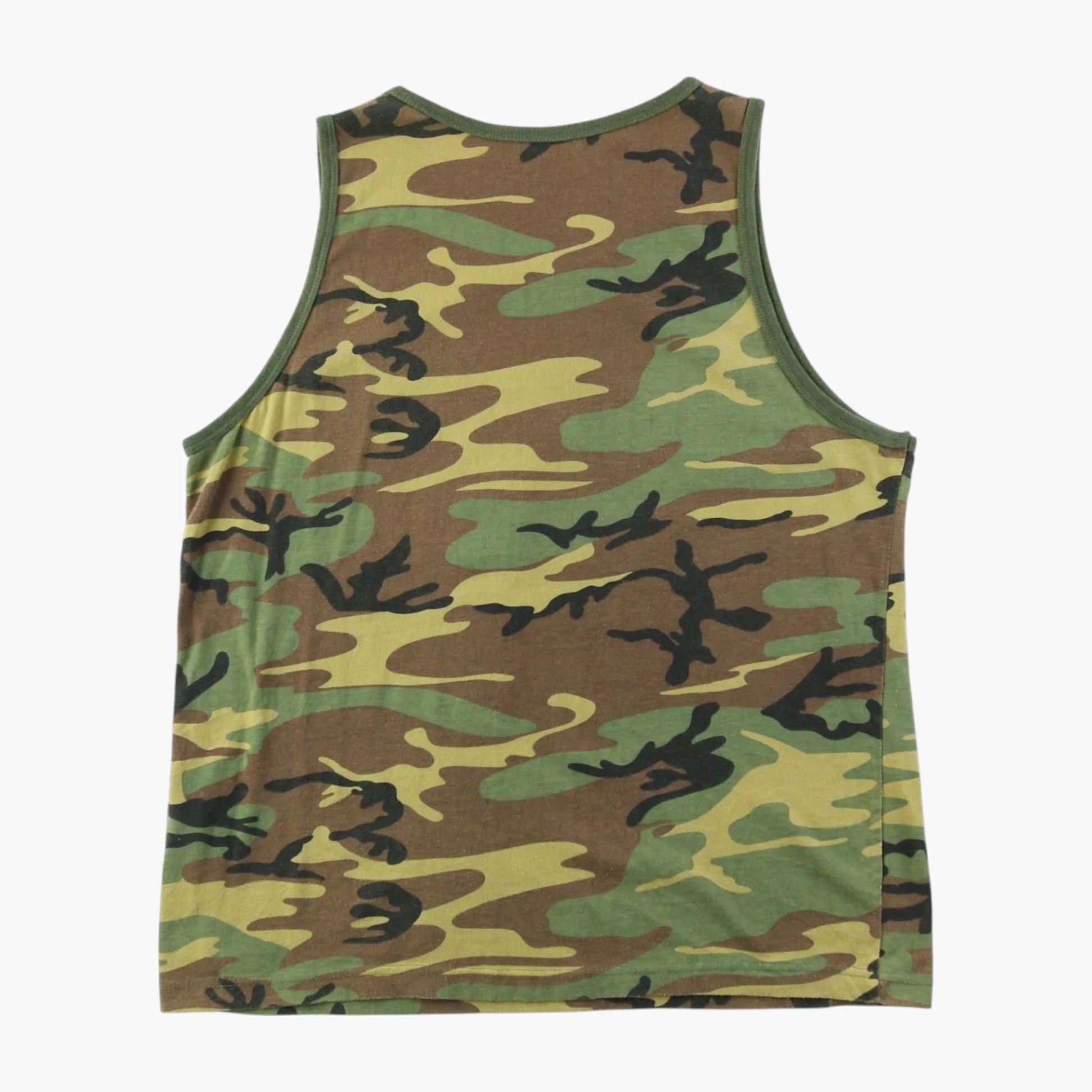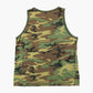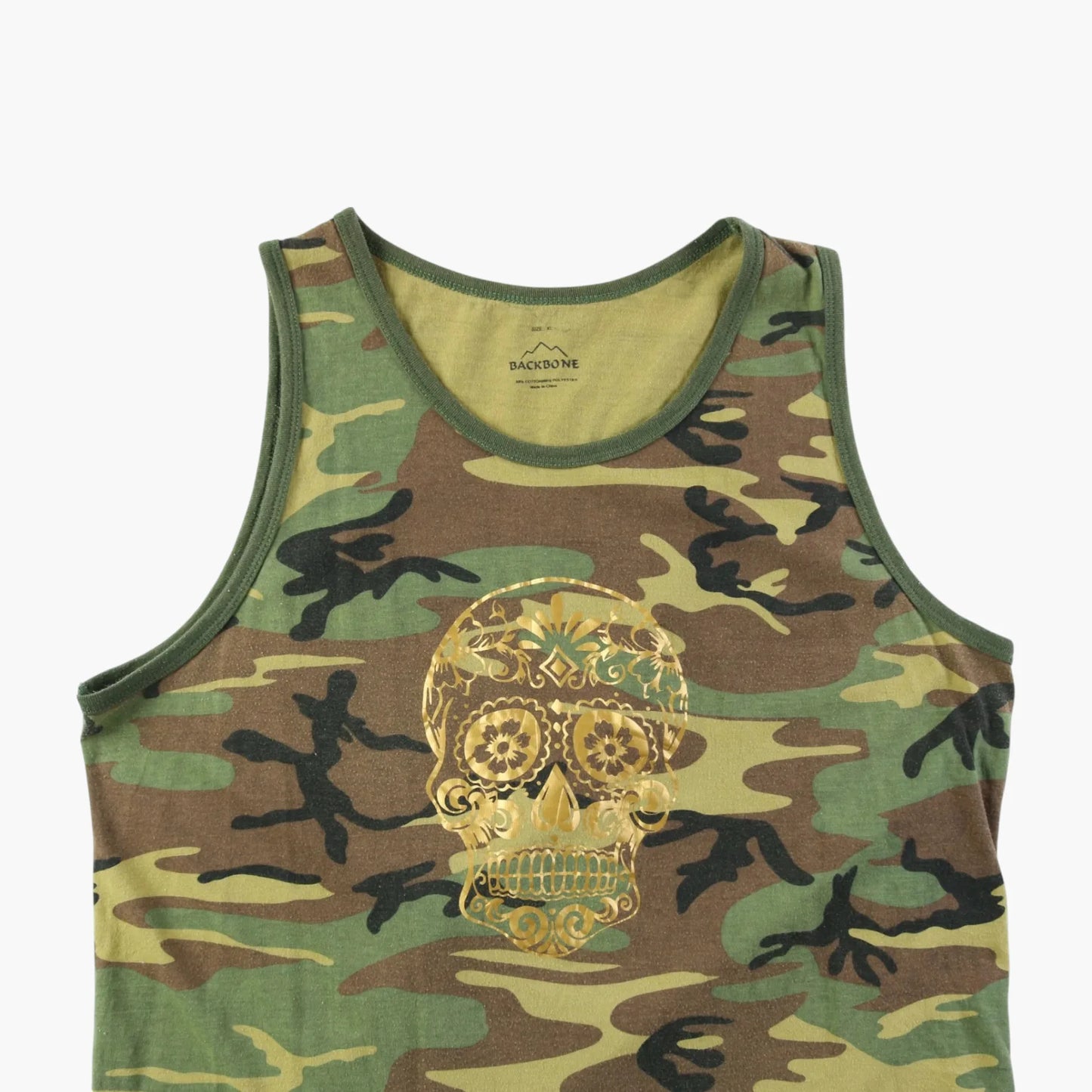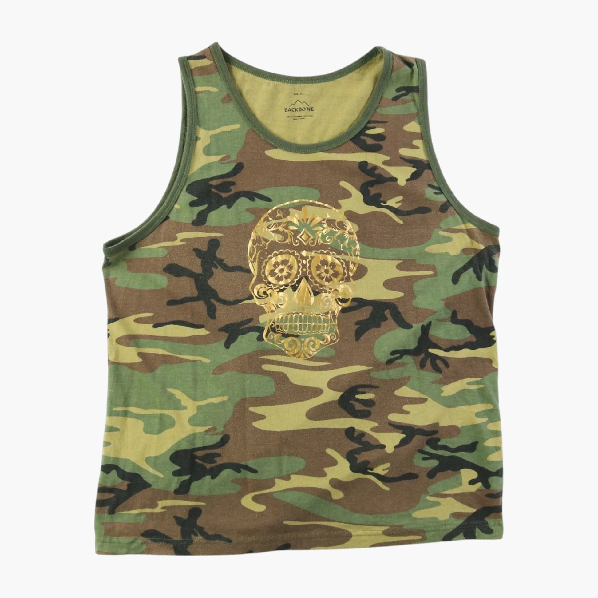 Vintage Vintage T-Shirts Tank Top in Camouflage. Camouflage printed sleeveless tank with a gold skull design, cotton-polyester blend.