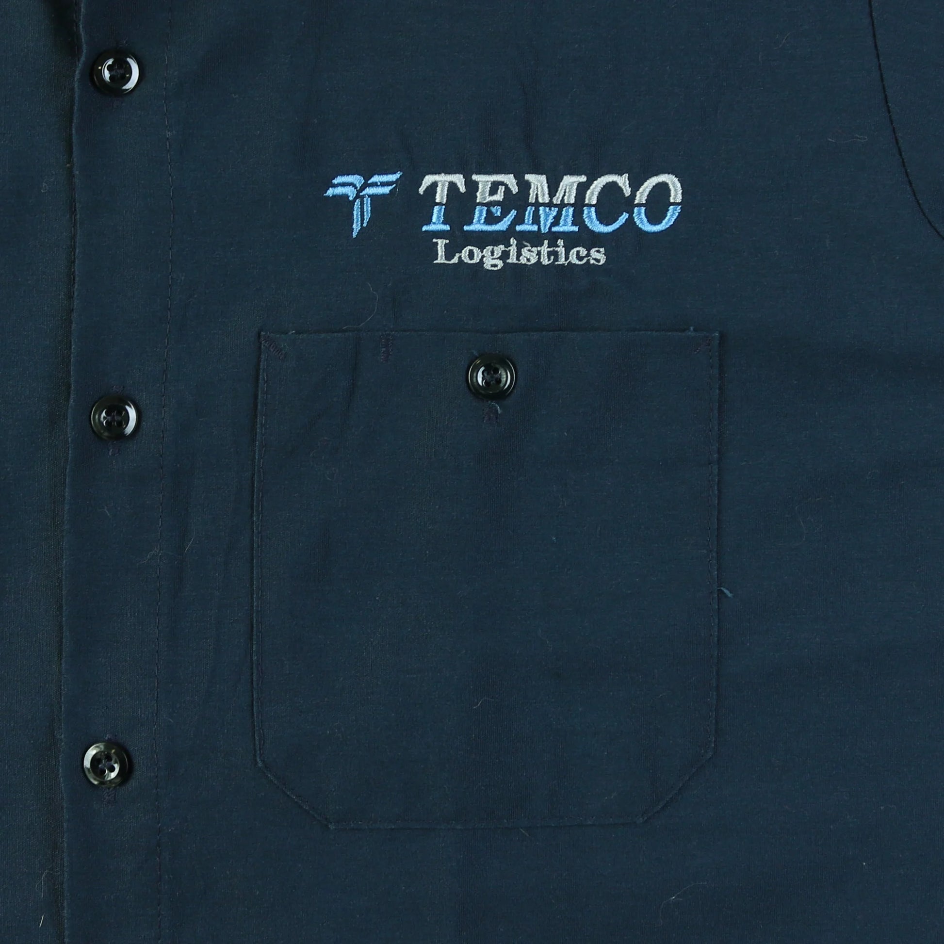 Vintage Garage Work Shirt in Navy. Navy blue, button-down, dual chest pockets, 'TEMCO Logistics' embroidery, 'TEMCO PRIDE' patch with American flag, durable poly-cotton fabric, label by RED KAP.