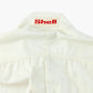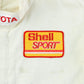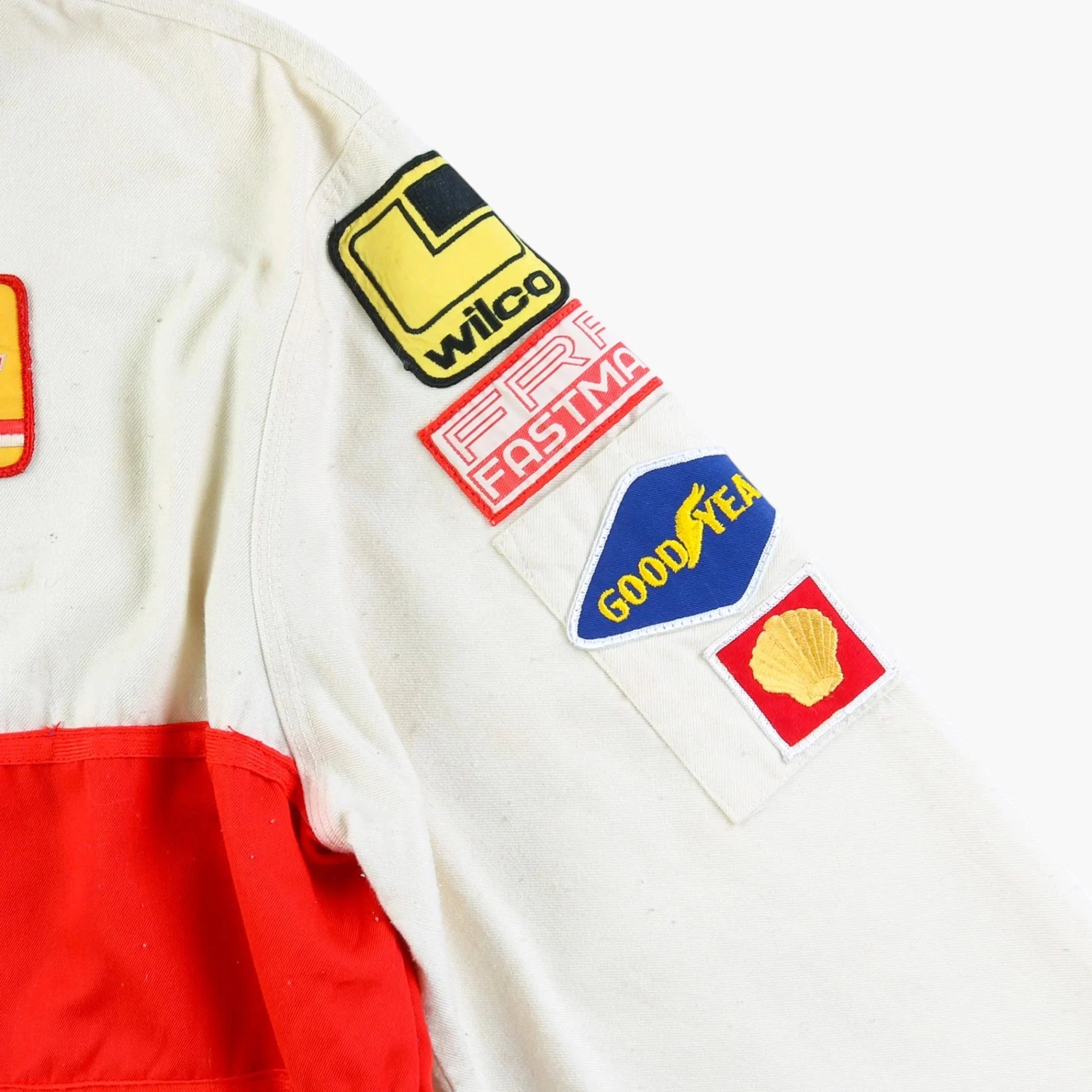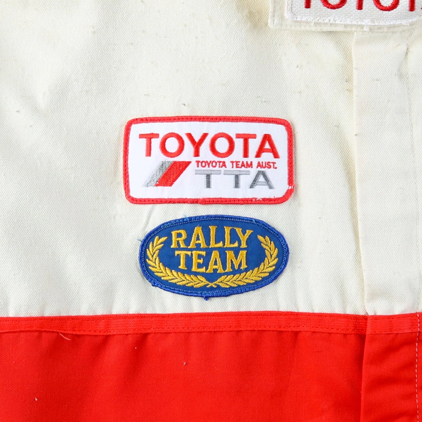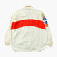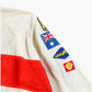 Vintage Toyota Jacket in Off White. Beige jacket with red stripe detailing and an array of embroidered patches featuring Shell, Goodyear, Wilco, and Toyota logos. Long-sleeved design with a red collar detail and rally theme embroidery.