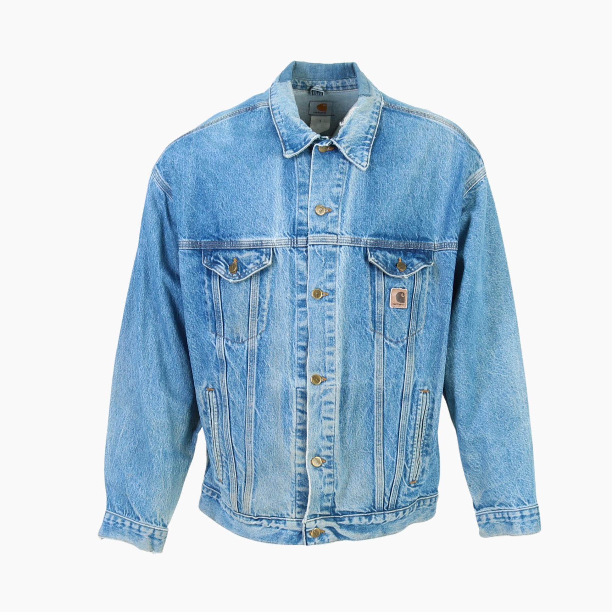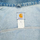 Vintage Carhartt Jacket in Denim. Carhartt blue denim jacket featuring a button-up design, two chest pockets with button closure, and a durable design. It's branded with the iconic Carhartt label and showcases a distressed vintage aesthetic.