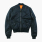Vintage Bomber Jacket in Navy. Quilted orange lining, multiple functional pockets, zippers, and synthetic fabric construction.