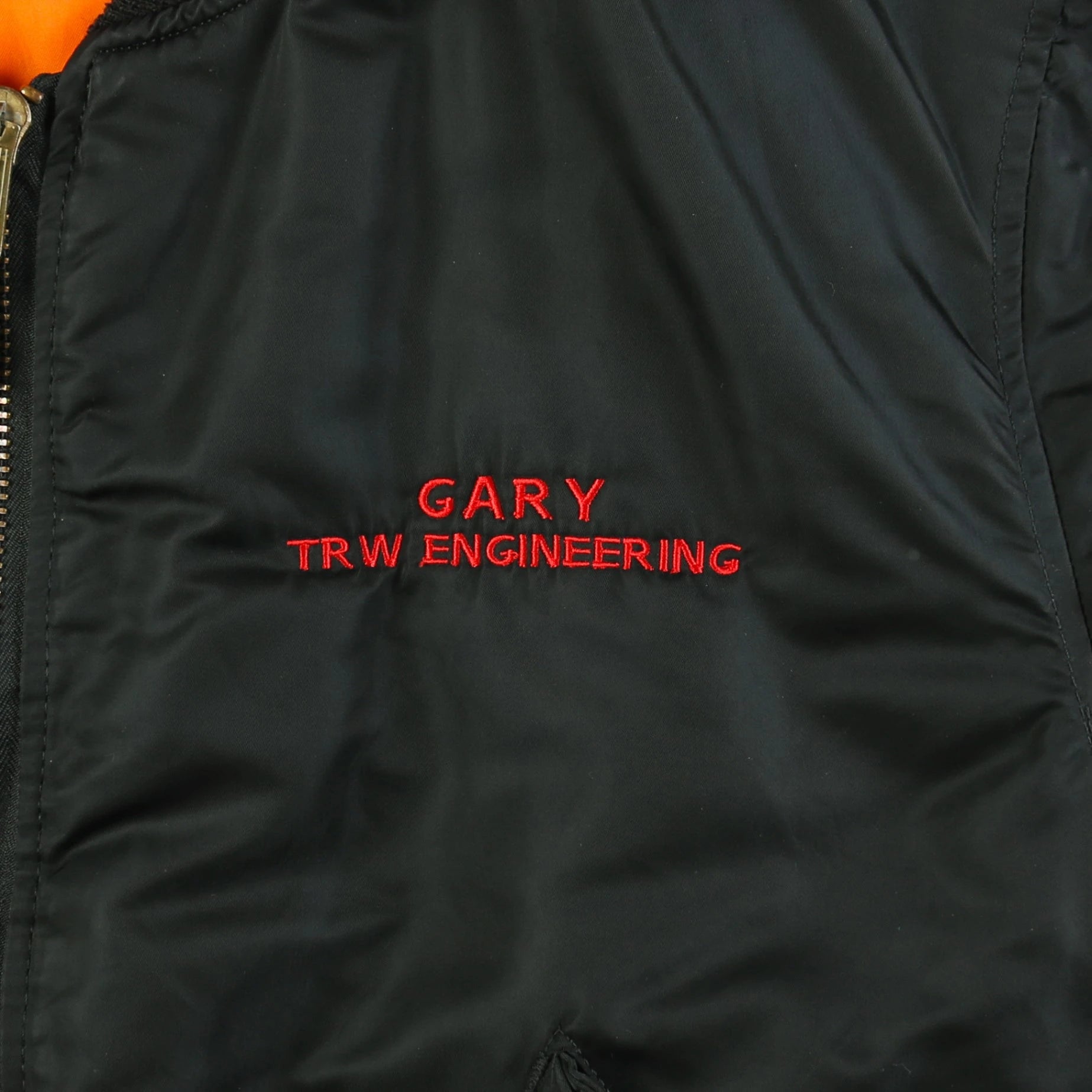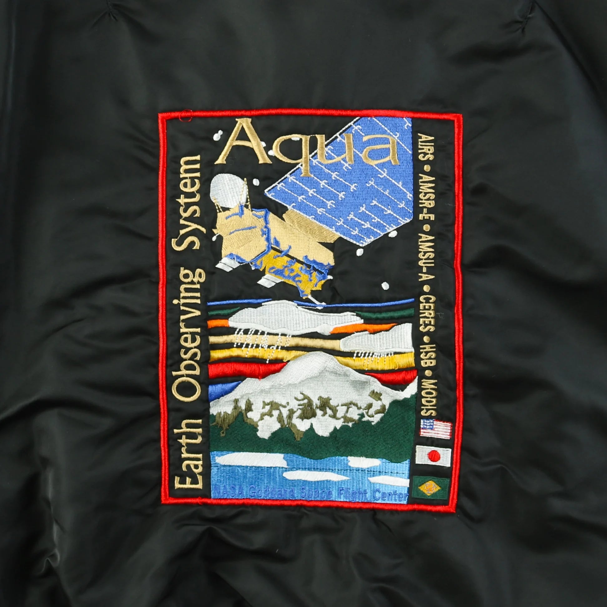 Vintage Bomber Jacket in Black. This black bomber jacket by Alpha Industries, Inc. boasts NASA and TRW Engineering embroidery, an arm pocket, and a large Aqua Earth Observing System patch on the back.