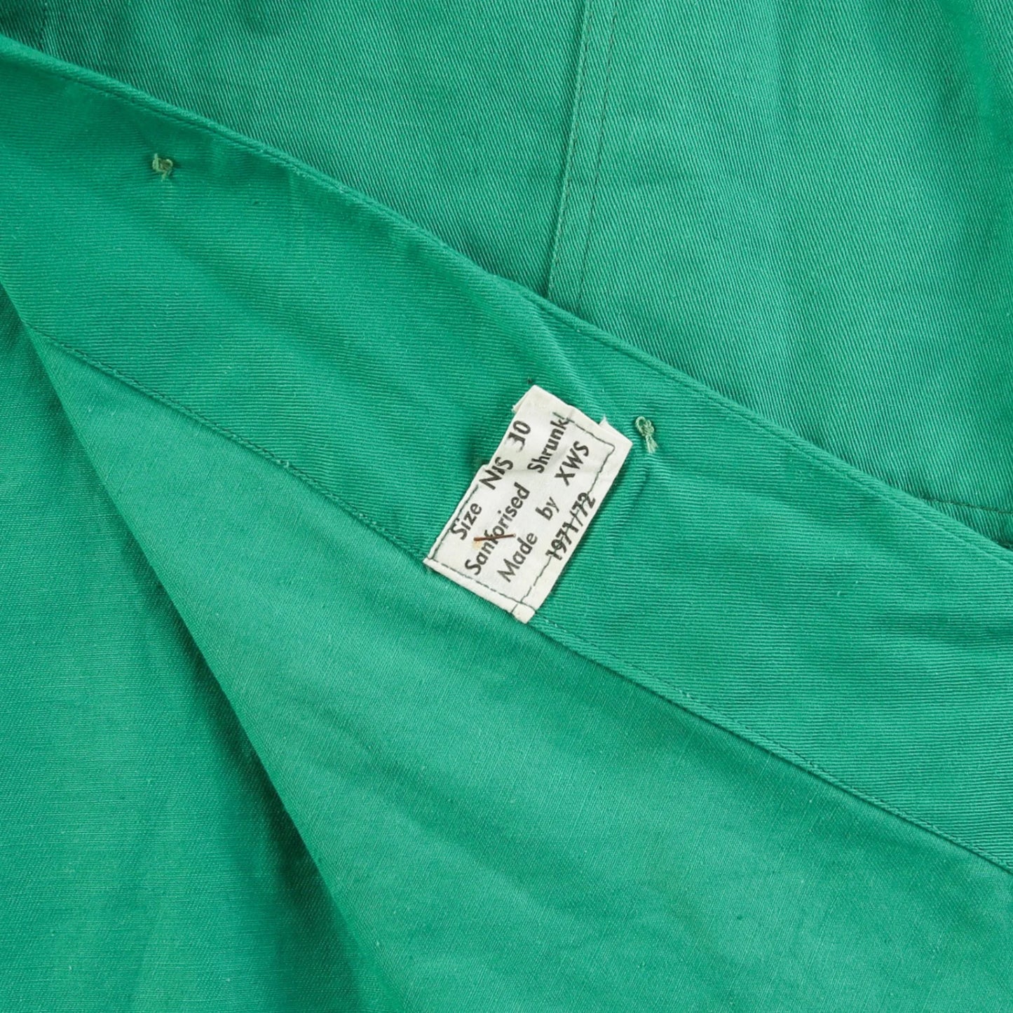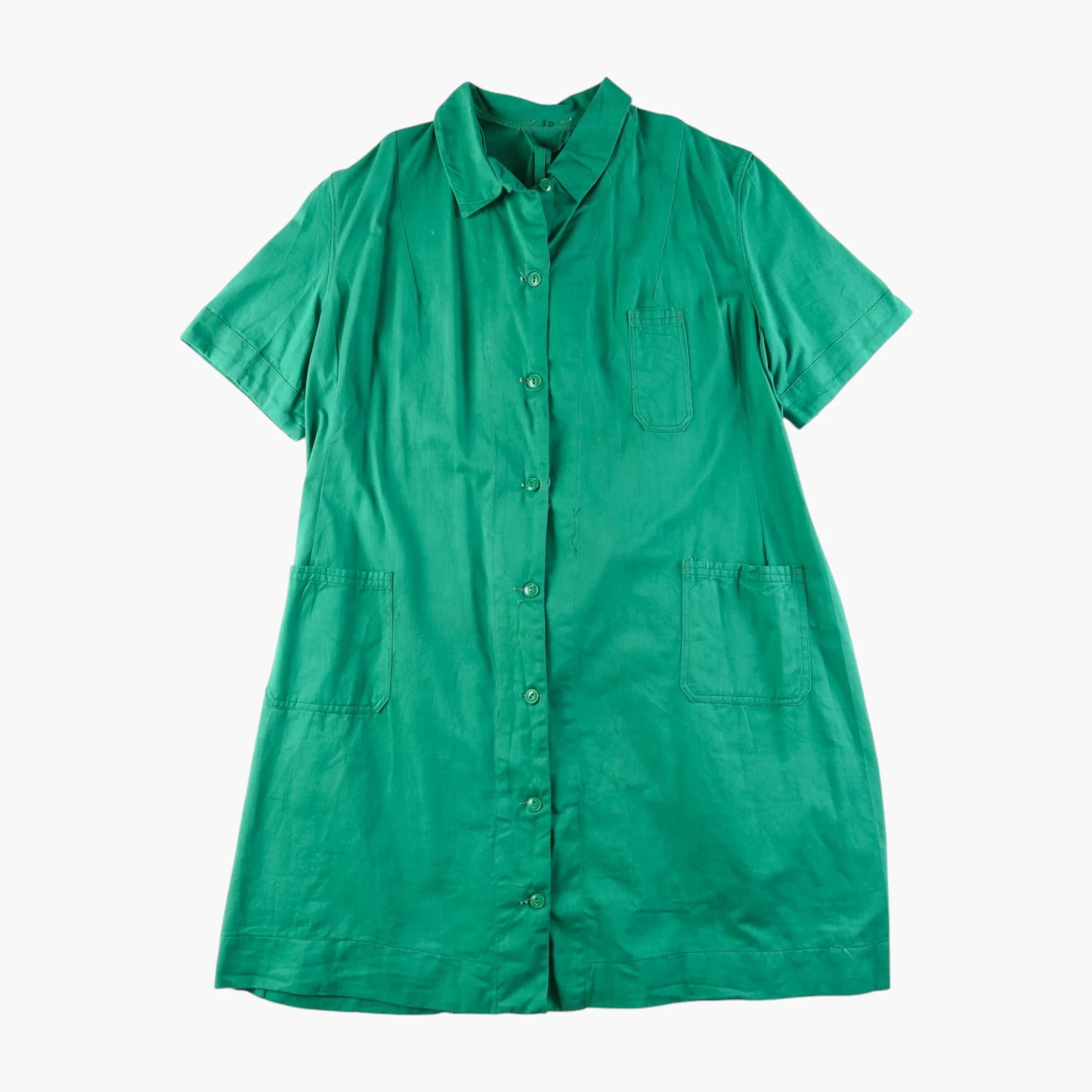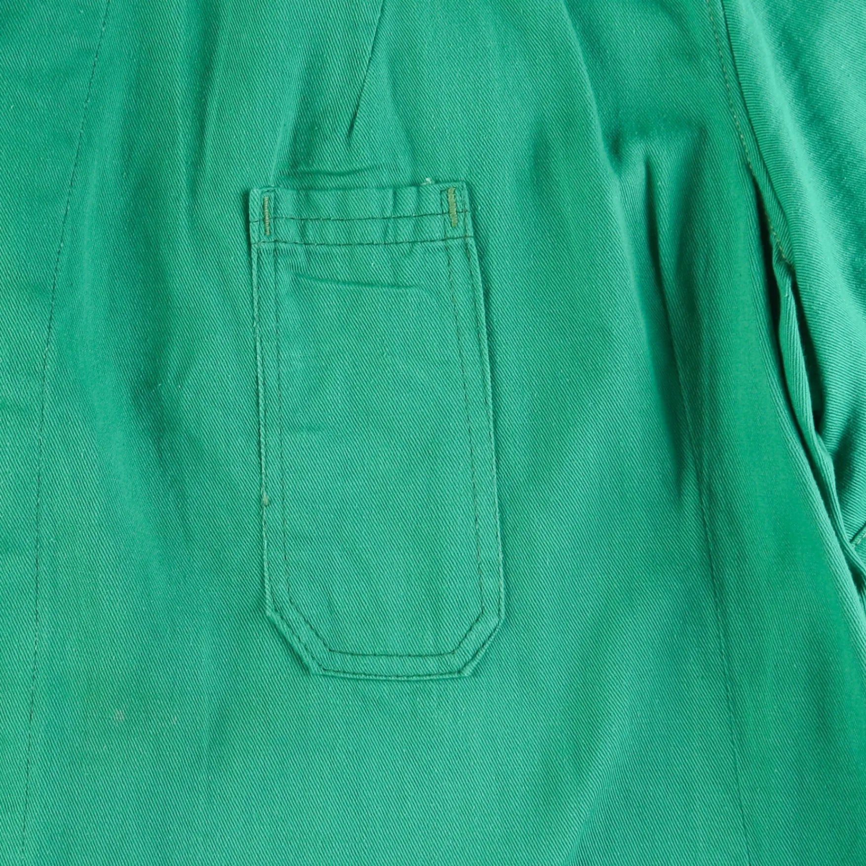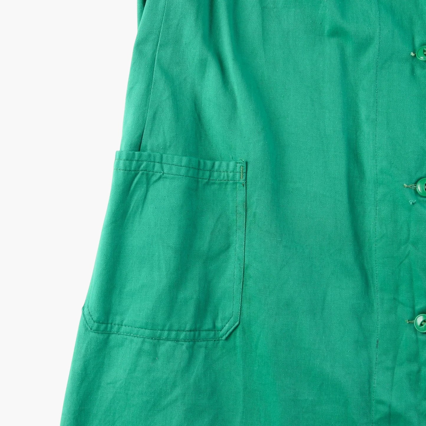 Vintage French Workwear Short-sleeve jacket in Green. Features front button closures, a classic modest collar, and multiple utility pockets on its front and back. Detailed stitching enhances its simple yet practical design.