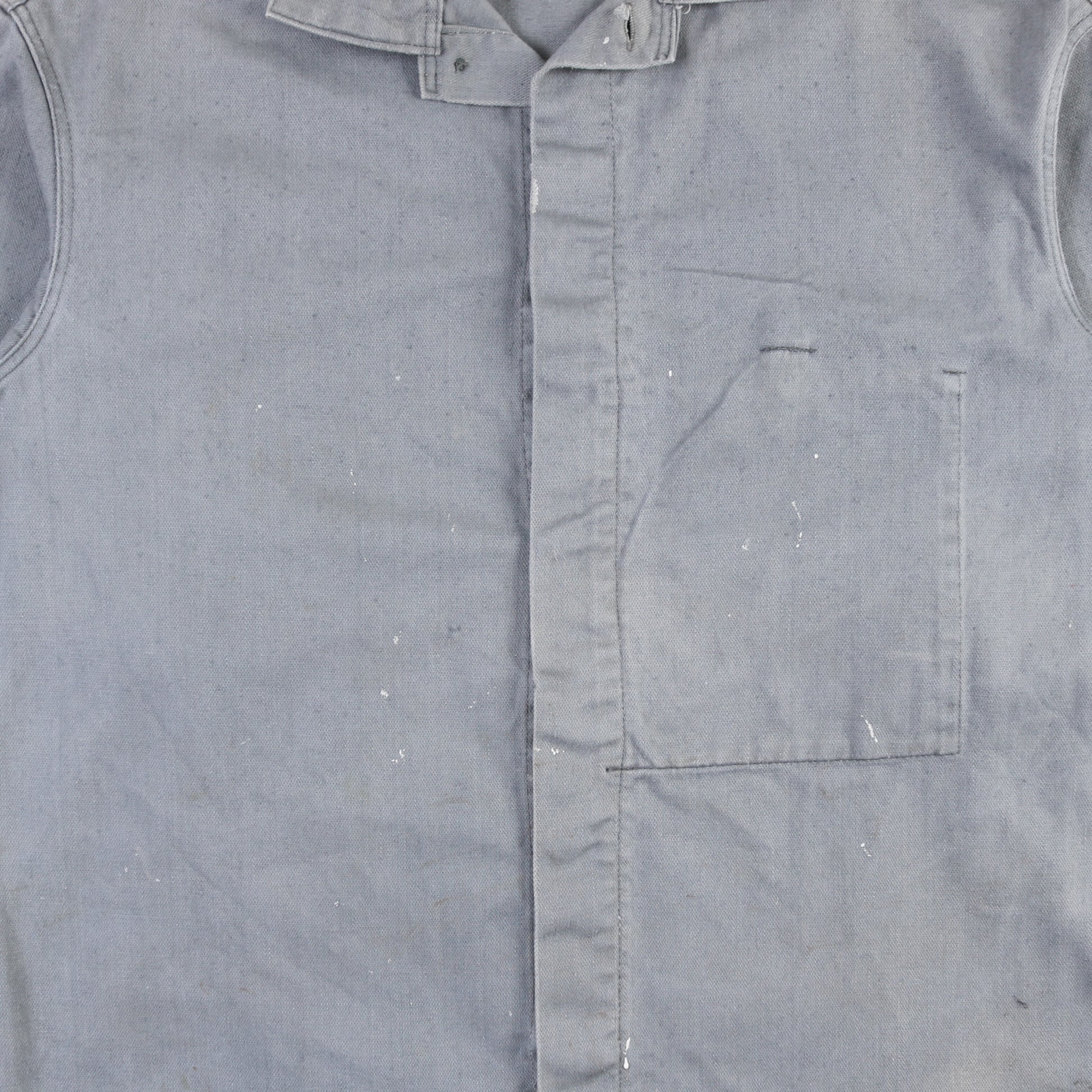 Workwear-style jacket in a faded grey-blue twill with a point collar, concealed front placket, and a single large square chest patch pocket. Visible paint speckling and light wear throughout; slight distressing/tear at the top of the placket near the collar. Straight hem with clean topstitching and a boxy, utilitarian silhouette.
