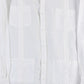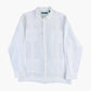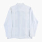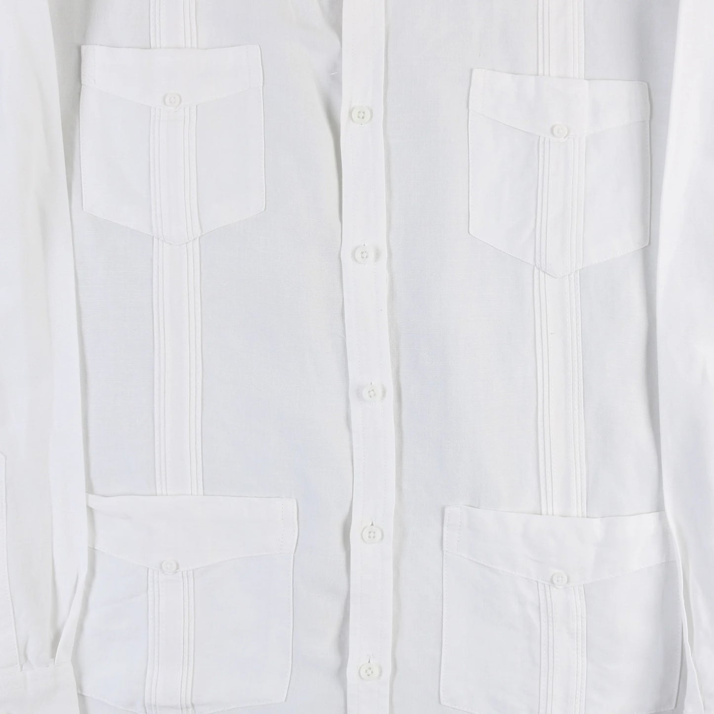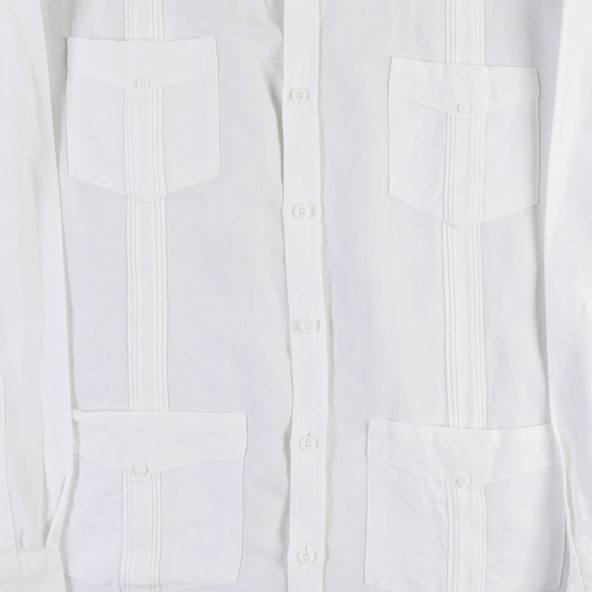 Vintage white long-sleeve guayabera shirt with four front patch pockets and vertical pintuck detailing; collared; tonal buttons; relaxed fit.