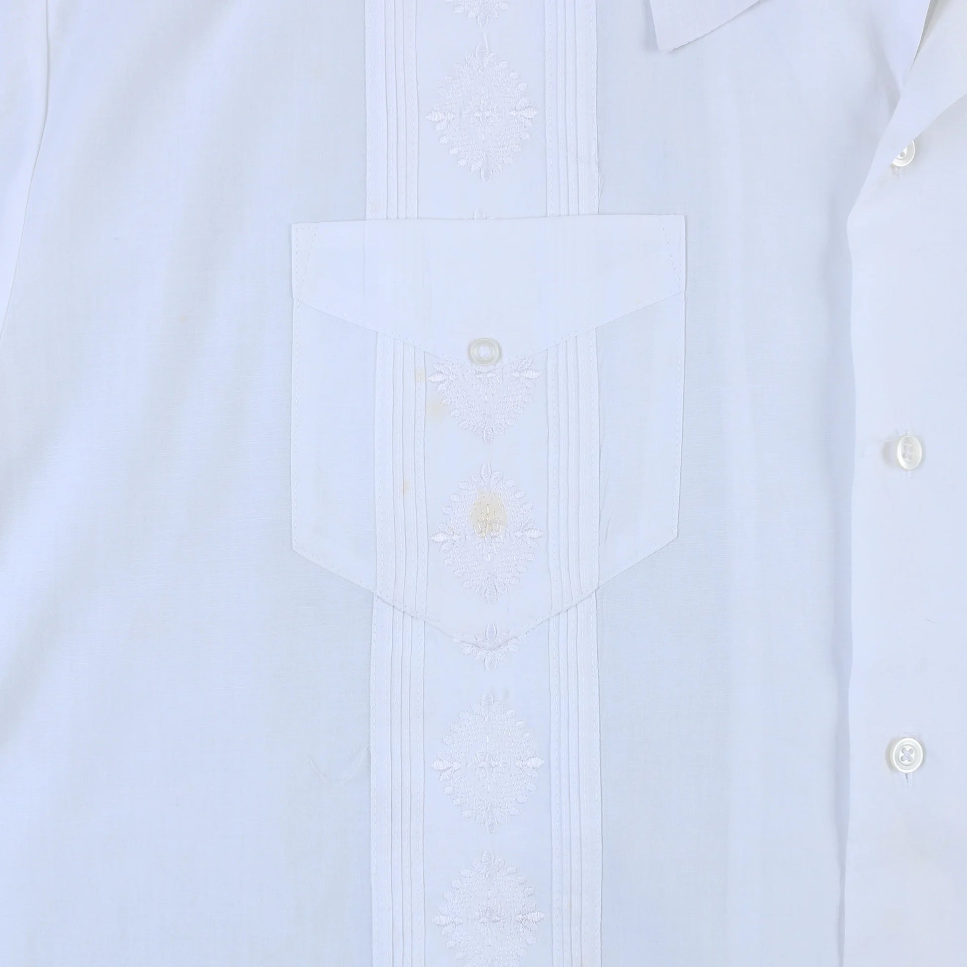 Vintage Vintage Cuban Guayabera Shirts Short-sleeved Shirt in White. Embroidered front panels, two front pockets, short sleeves, lightweight fabric.