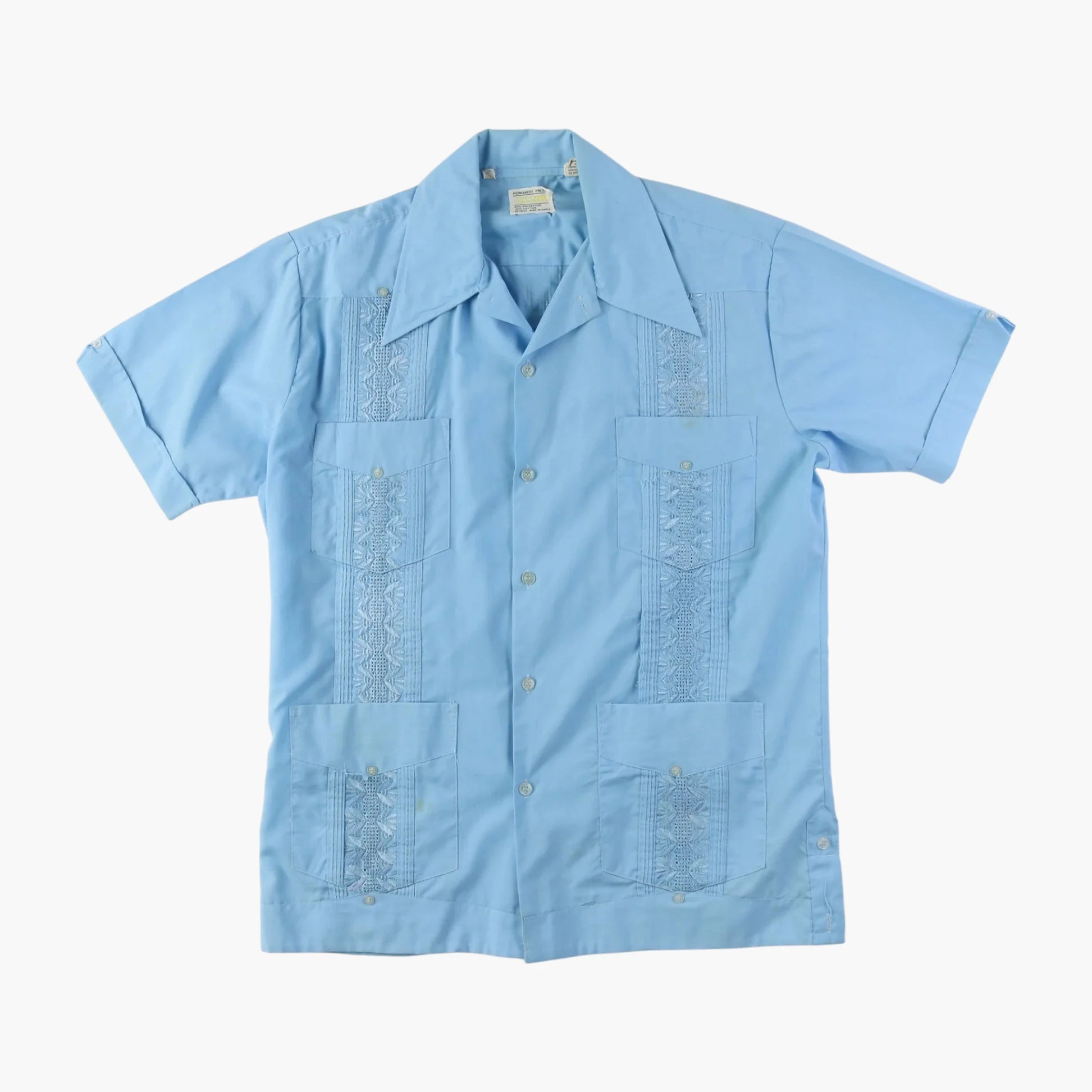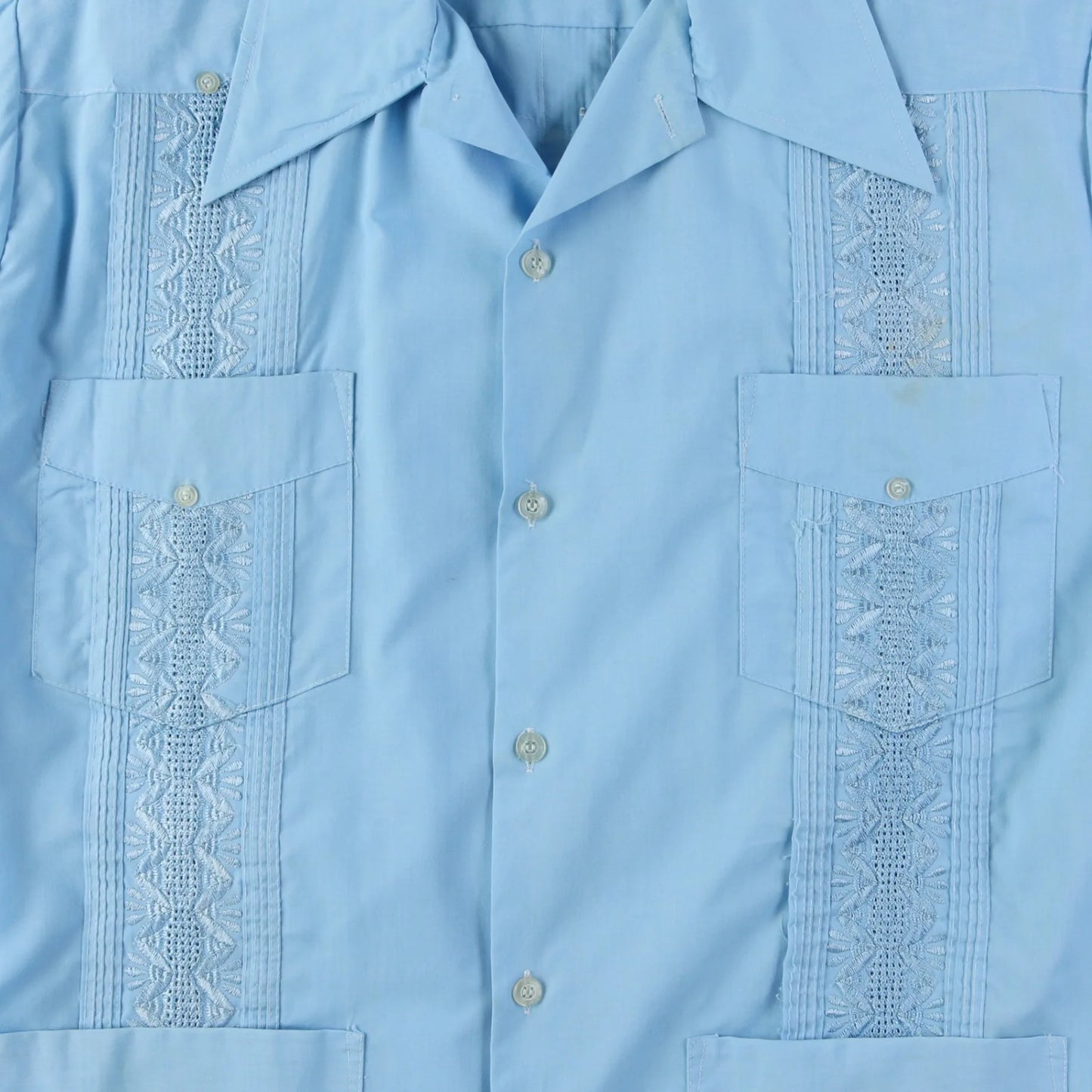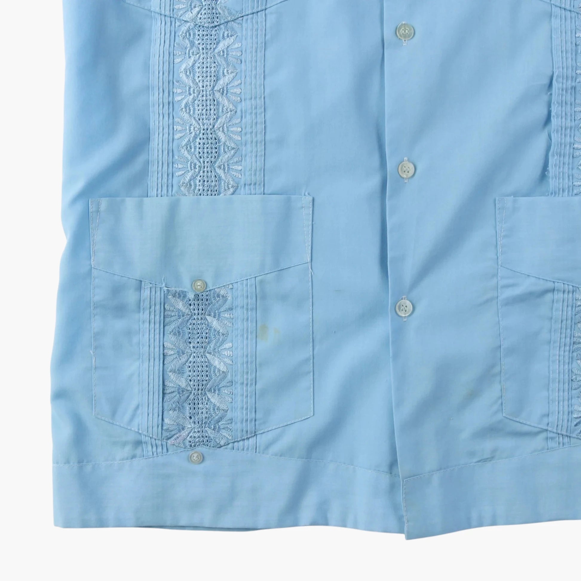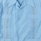 Vintage Cuban Guayabera Shirt in Blue. Pastel blue shade, intricate front embroidery, double chest pockets, classic guayabera design with short sleeves.