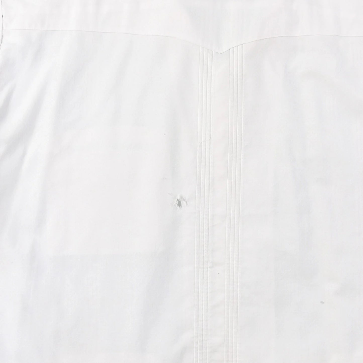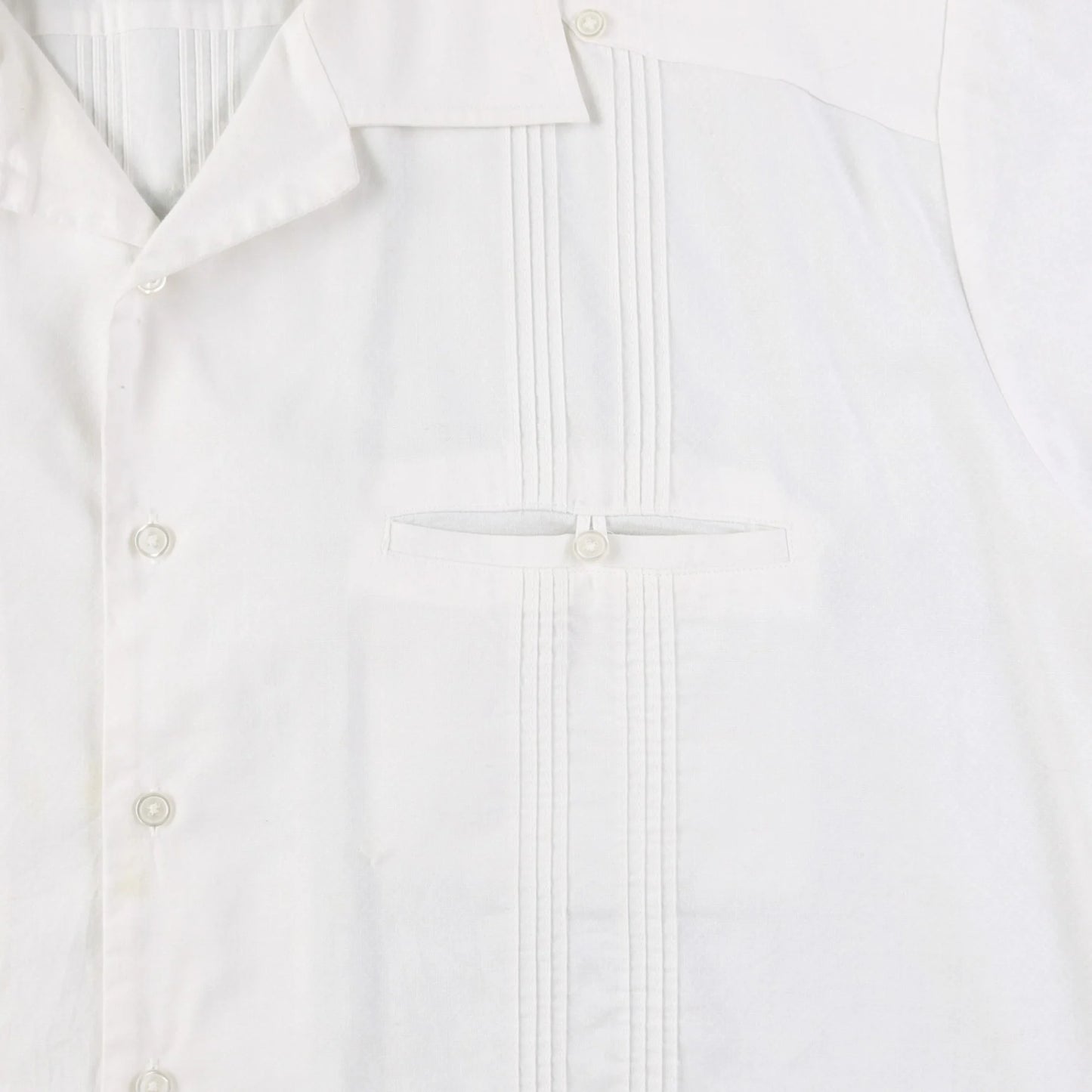 Vintage Cuban Guayabera Shirt in White. White fabric with signature pintucks, two front pockets, button closure, and short sleeves.