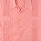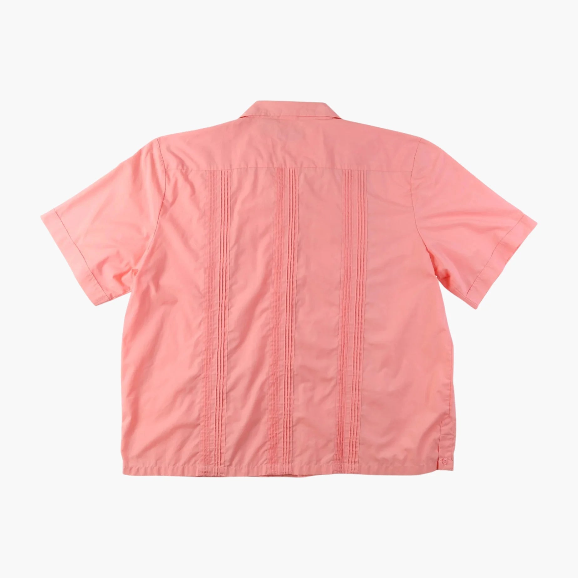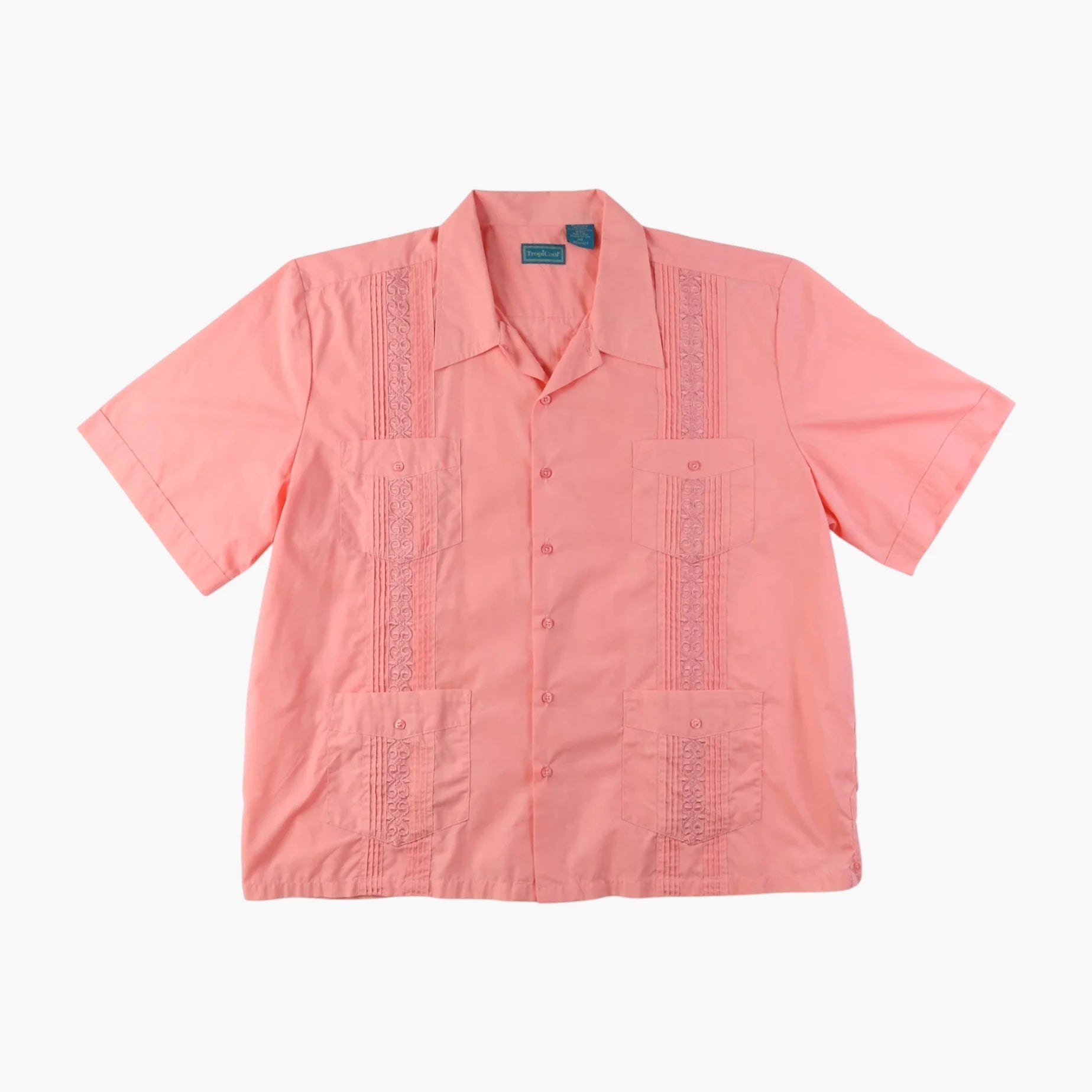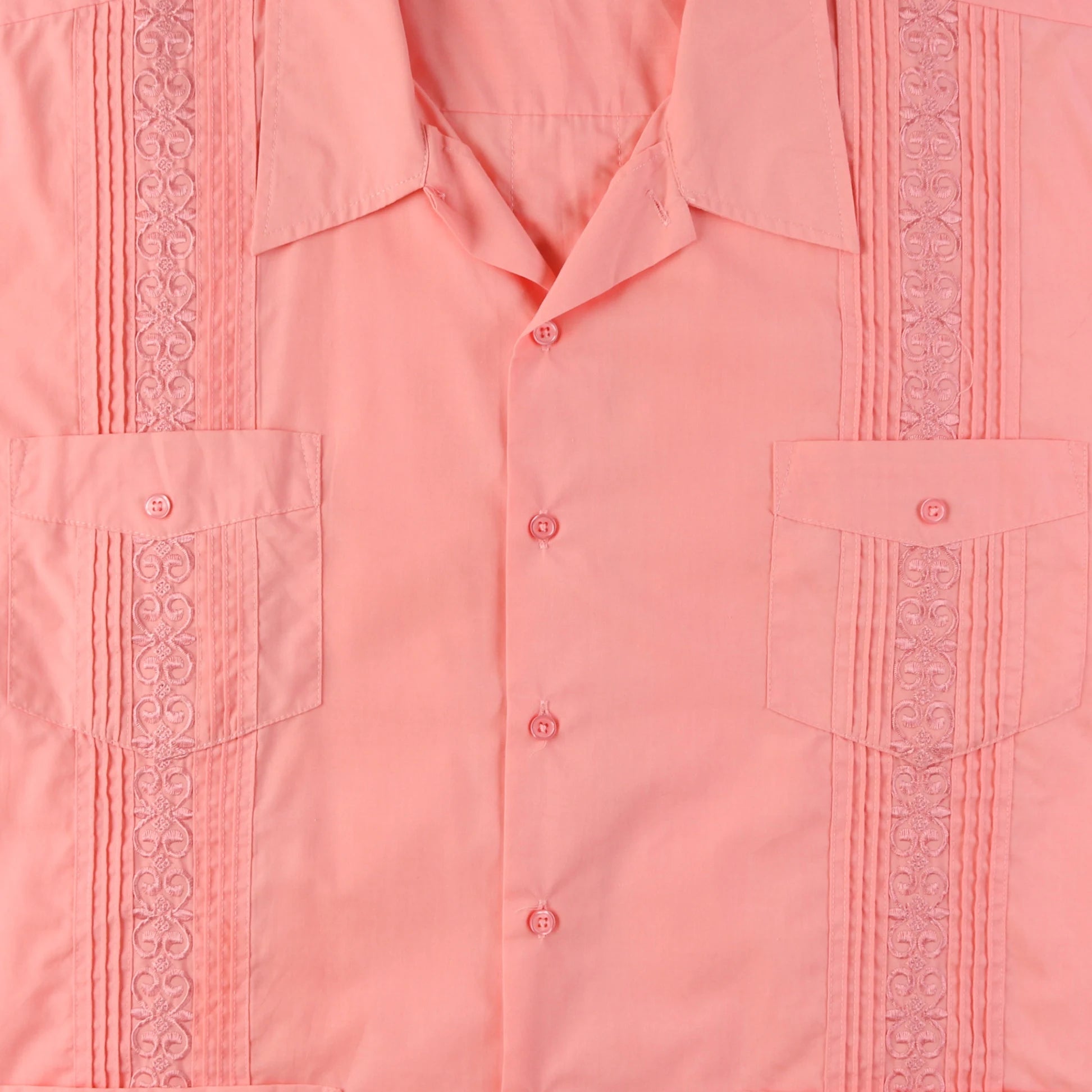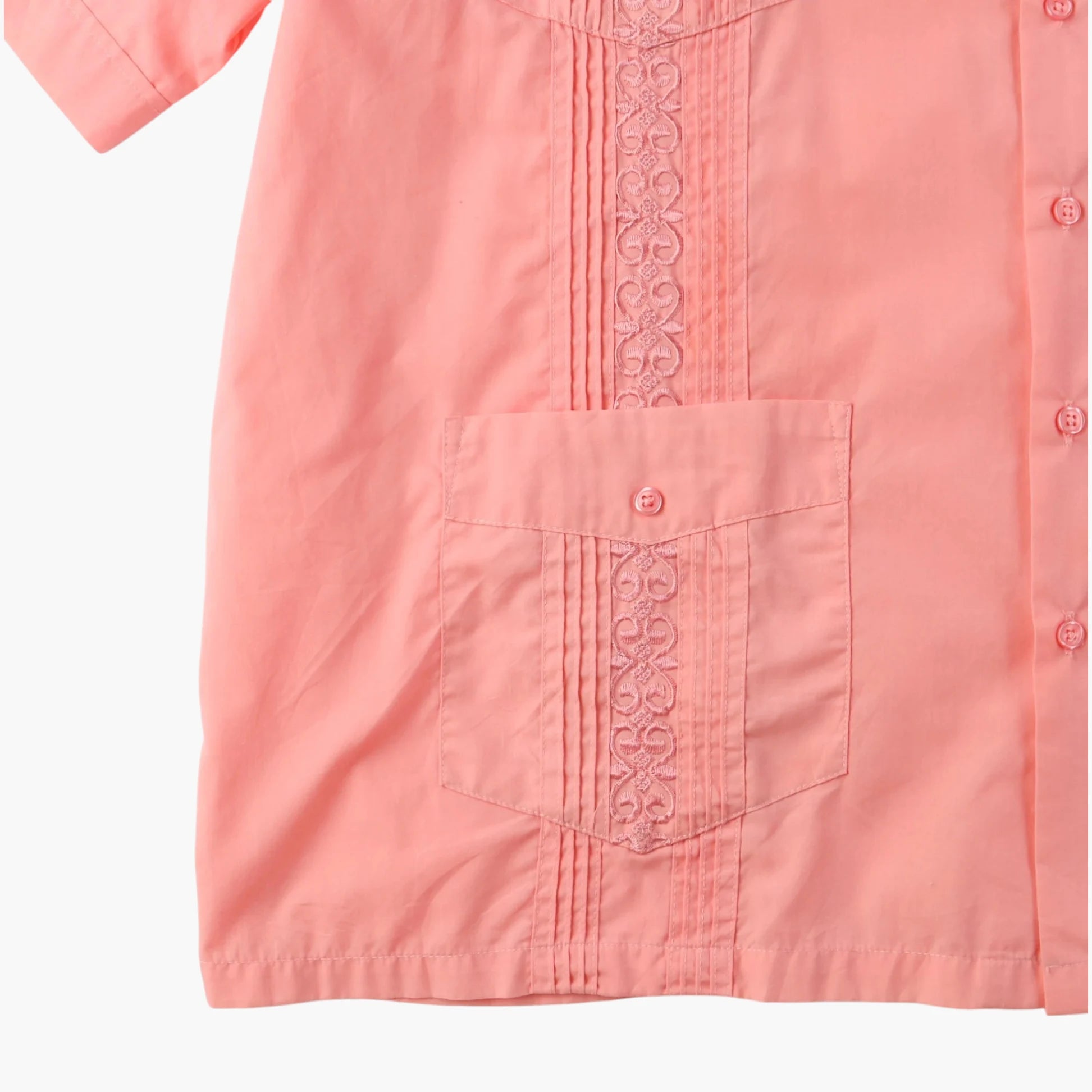 Vintage Cuban Guayabera Shirt in Pink. Traditional guayabera shirt with front button closure, embroidered details, four front pockets, and pleating.