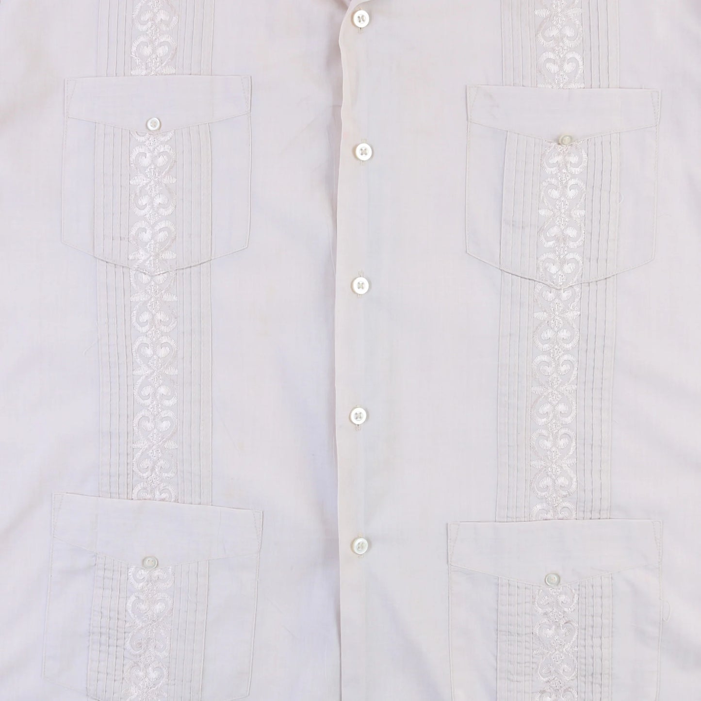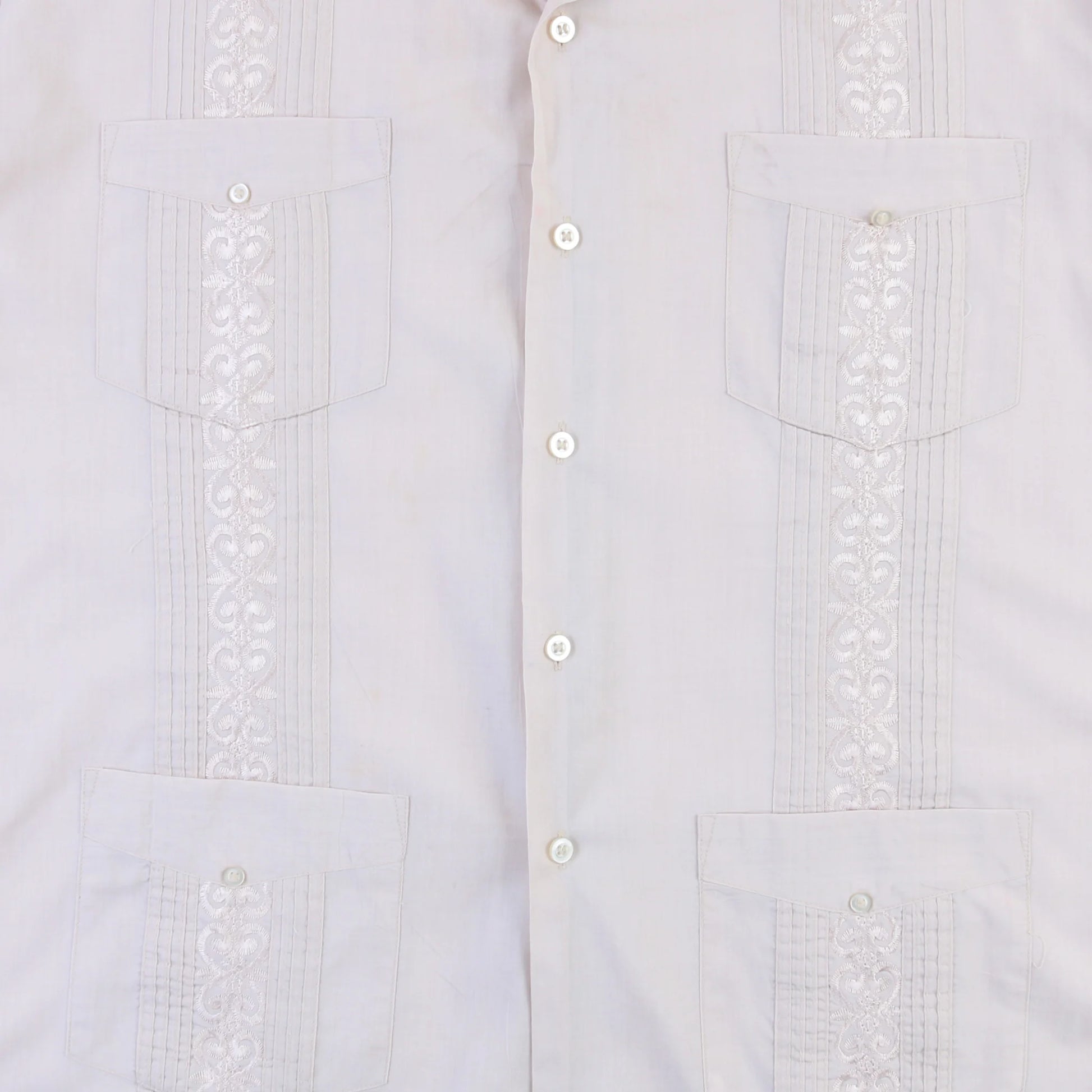 Vintage Vintage Cuban Guayabera Shirts Short Sleeve Shirt in Beige. Short sleeve guayabera with white embroidery, lightweight fabric, four front pockets, pointed collar, classic pleats, subtle sheen, pearlized buttons.