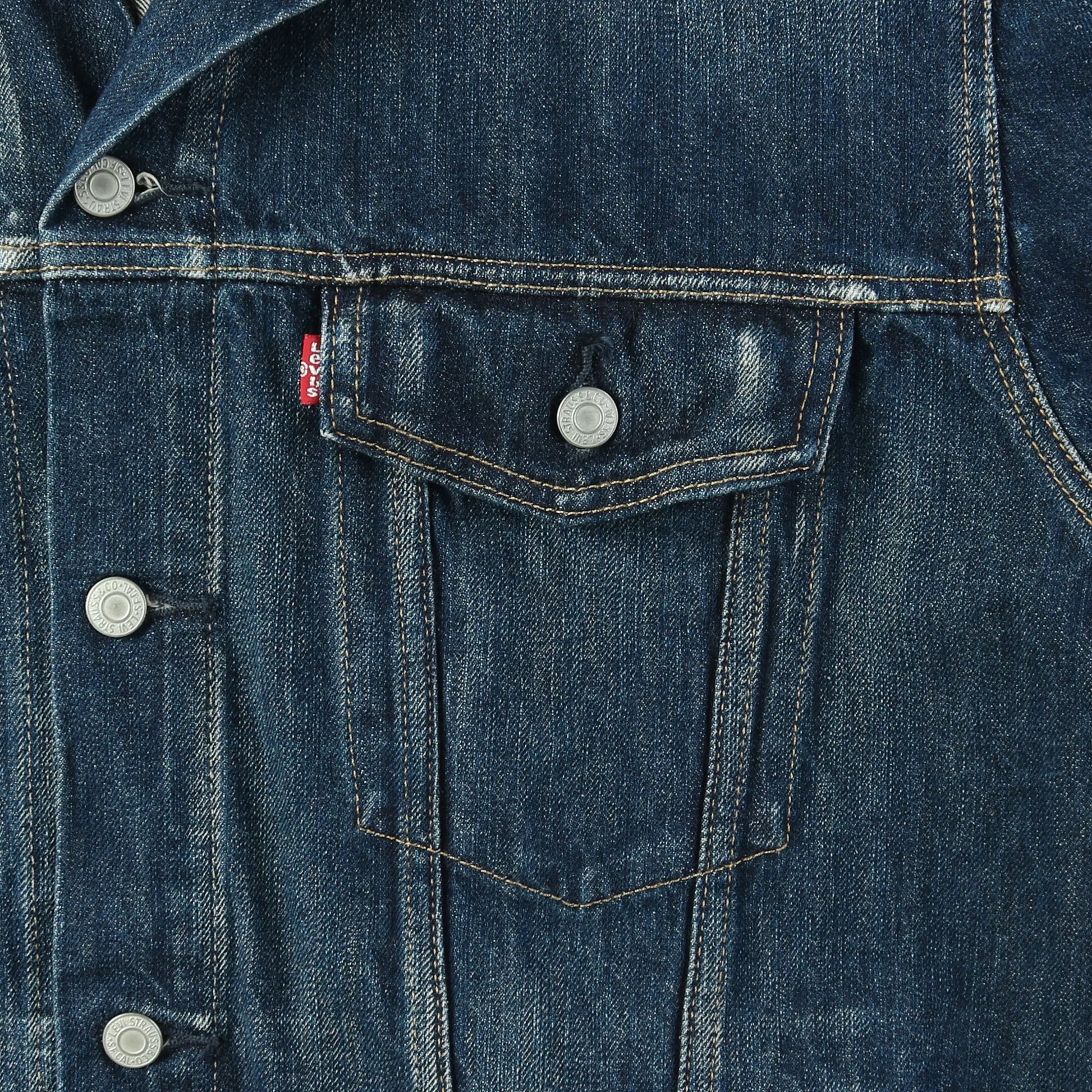 Vintage Levi's Jacket in Blue. Classic Levi's trucker-style denim jacket with signature rivets, fading for a worn-in look, and the distinctive red tag and back label.