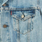 Vintage Levi's Jacket in Blue. Made from authentic denim material, this jacket showcases metal buttons embossed with Levi's insignias, double chest square pockets, practical side hand pockets, and an adjustable waistband.
