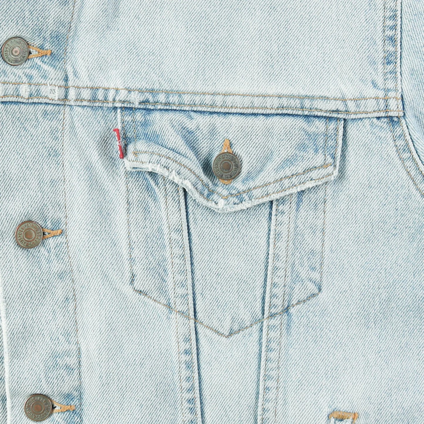 Vintage Levi's Jacket in Blue. Light wash denim, button closures, dual chest flap pockets with buttons, Levi's signature branding.
