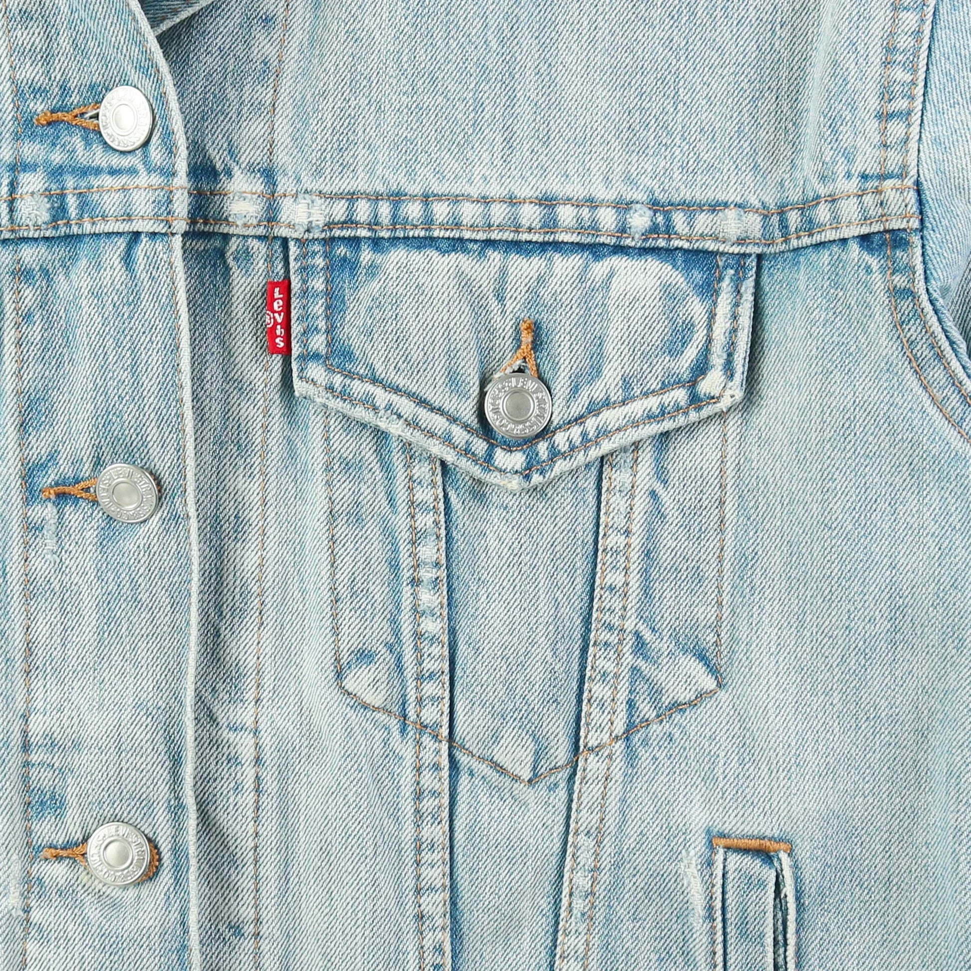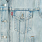 Vintage Levi's Denim Jacket in Denim. Light blue faded denim, button-up front, pointed flap pockets with buttons, Levi's red tab, branded metal buttons, tan contrast stitching, light abrasion/distressing.
