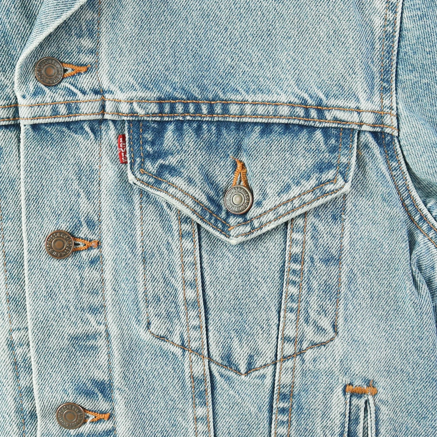 Vintage Levi's Jacket in Blue. Light blue denim with faded accents. Traditional Levi's copper rivet buttons and stitched logo tag.