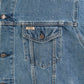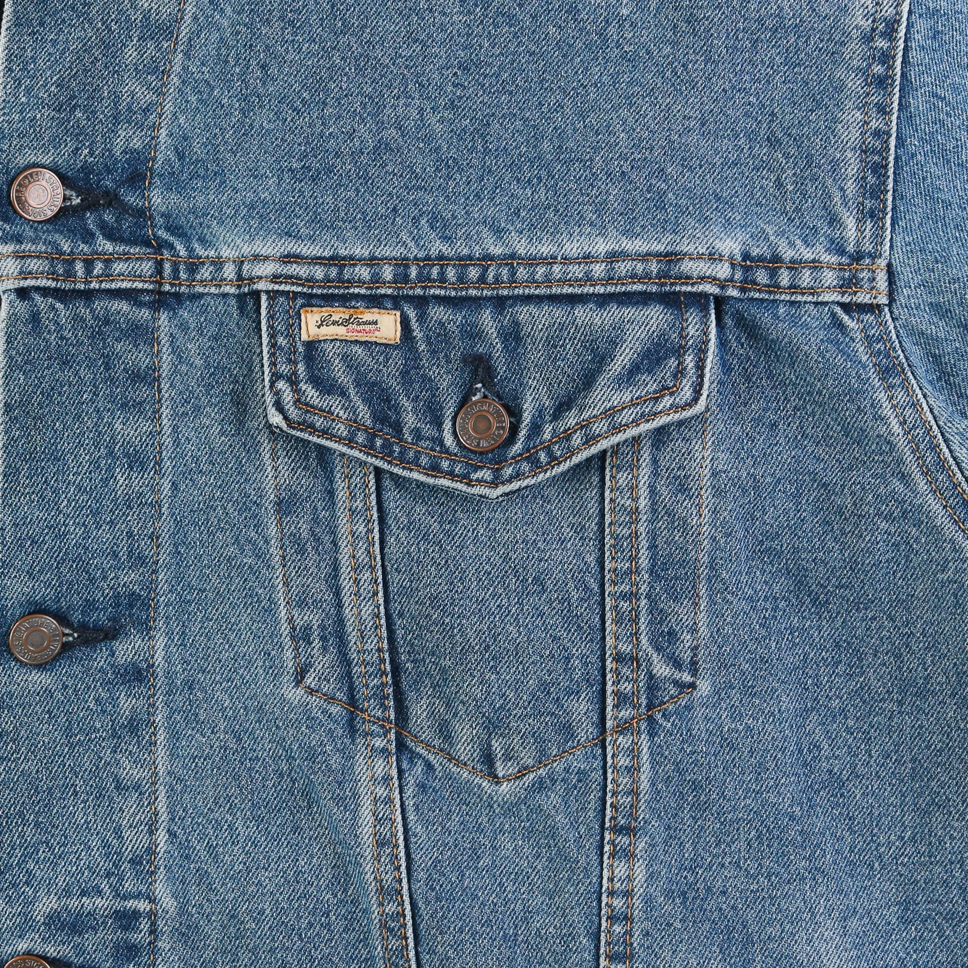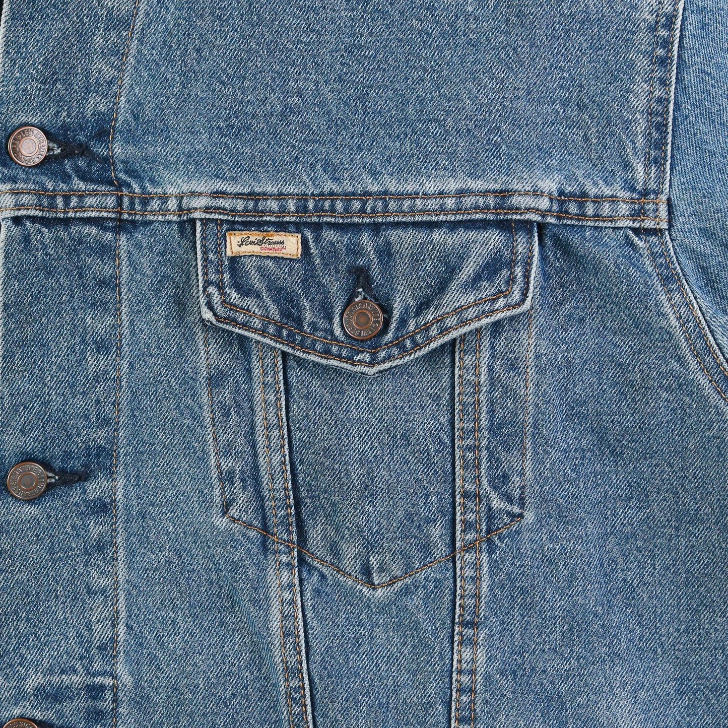 Vintage Levi's Denim Jacket. Distinctive blue faded denim with sturdy button closures, contrast stitching, branded metal buttons, dual chest flap pockets, vertical hand pockets, and a woven Levi Strauss Signature logo tag above the left pocket.