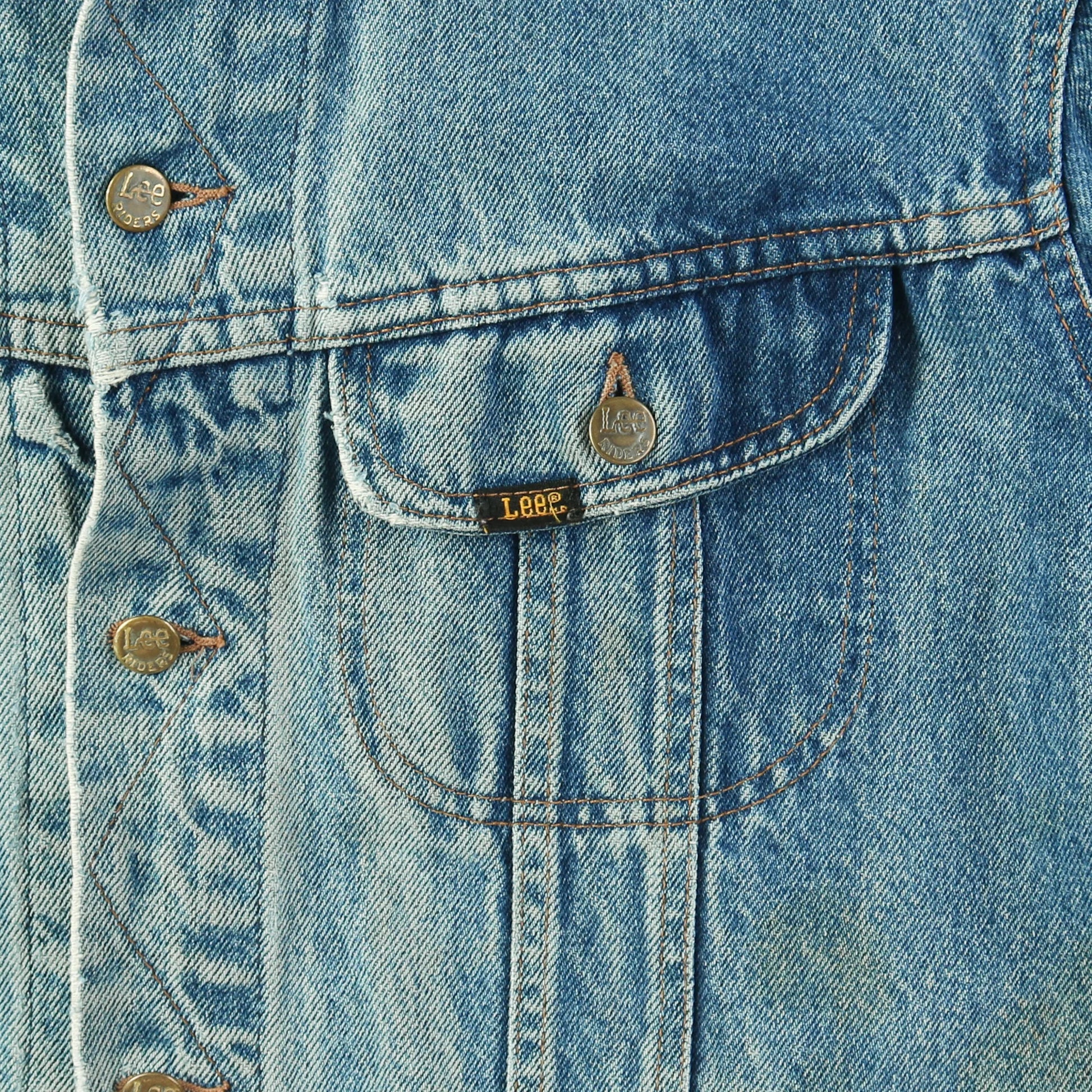 Vintage Lee Denim Jacket in Blue. Classic denim jacket with subtle fading, brass-tone buttons, and Lee brand labeling on the chest pocket.