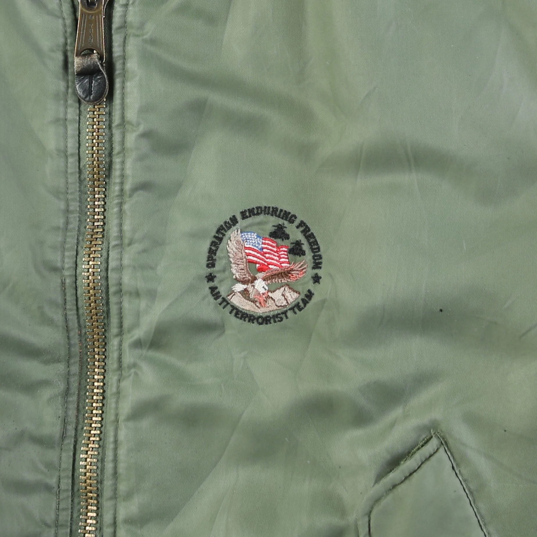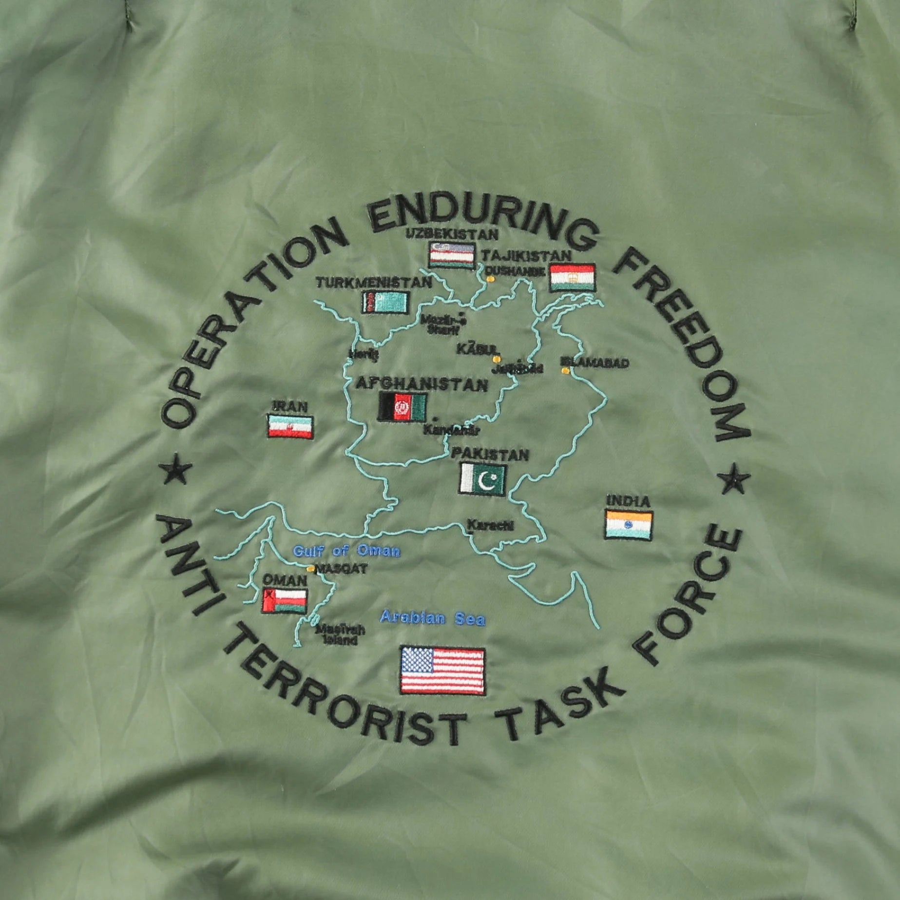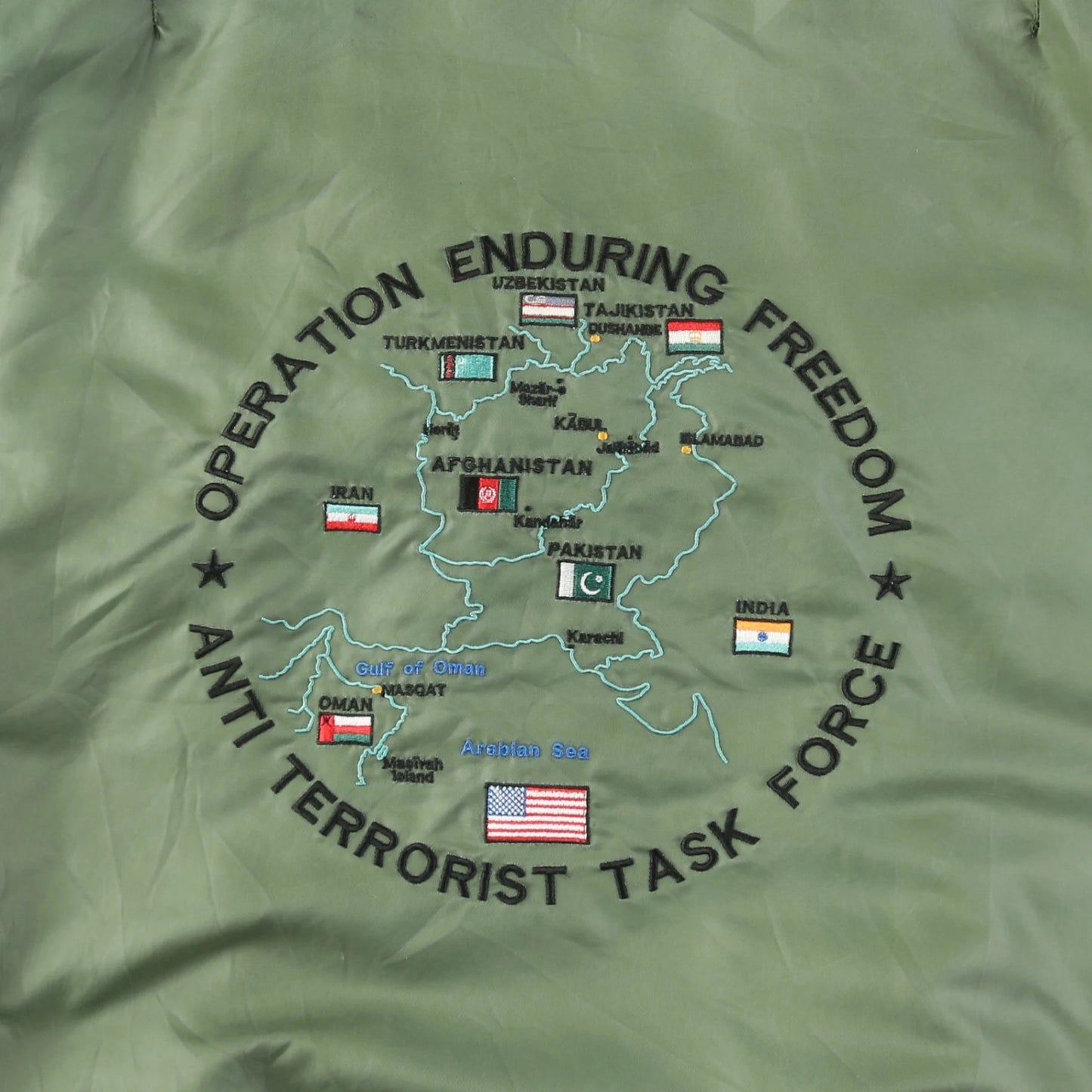 Vintage Bomber Jacket in Green. Features intricate embroidery on the back showcasing a message supporting Operation Enduring Freedom and Anti Terrorist Task Force. Durable nylon material and iconic military styling.