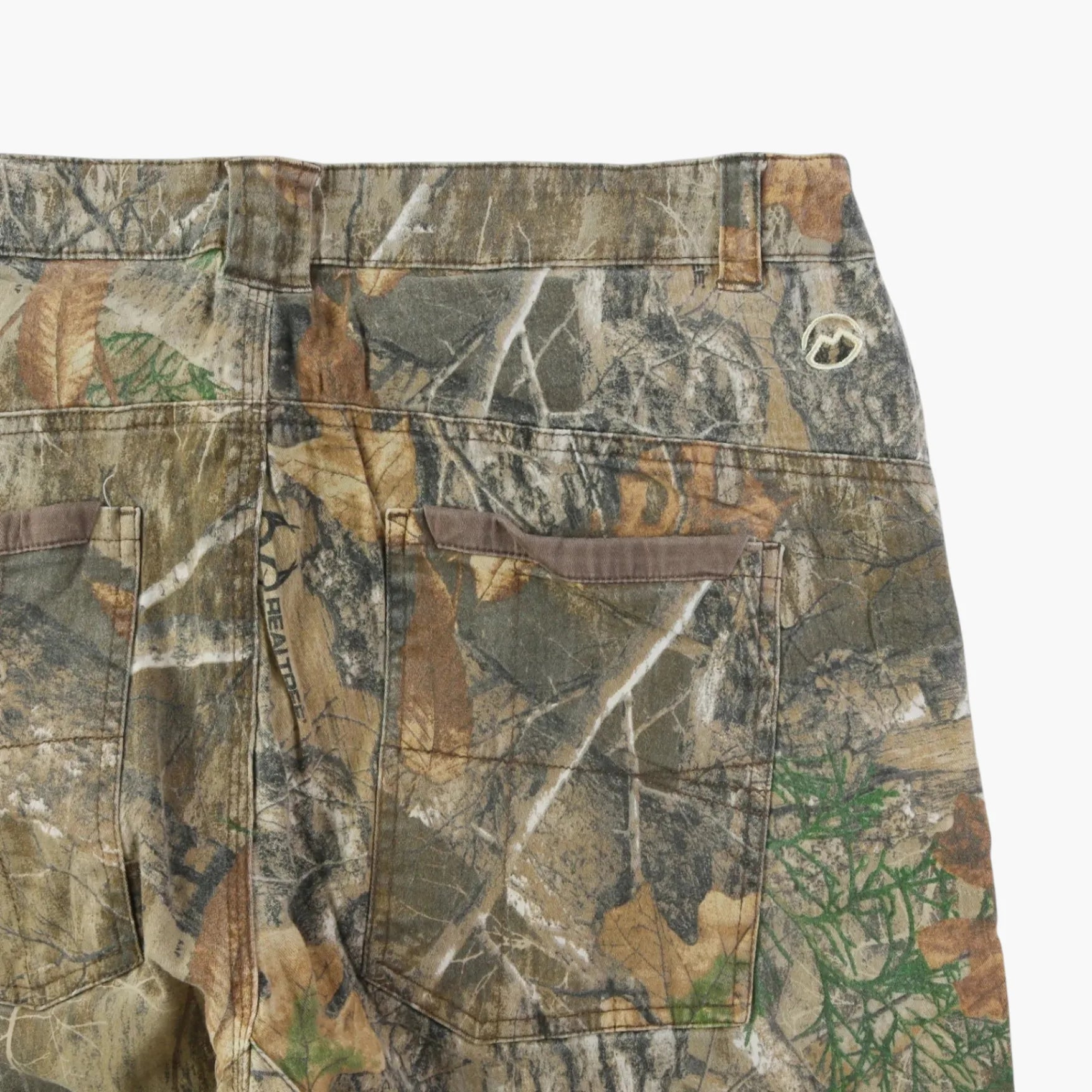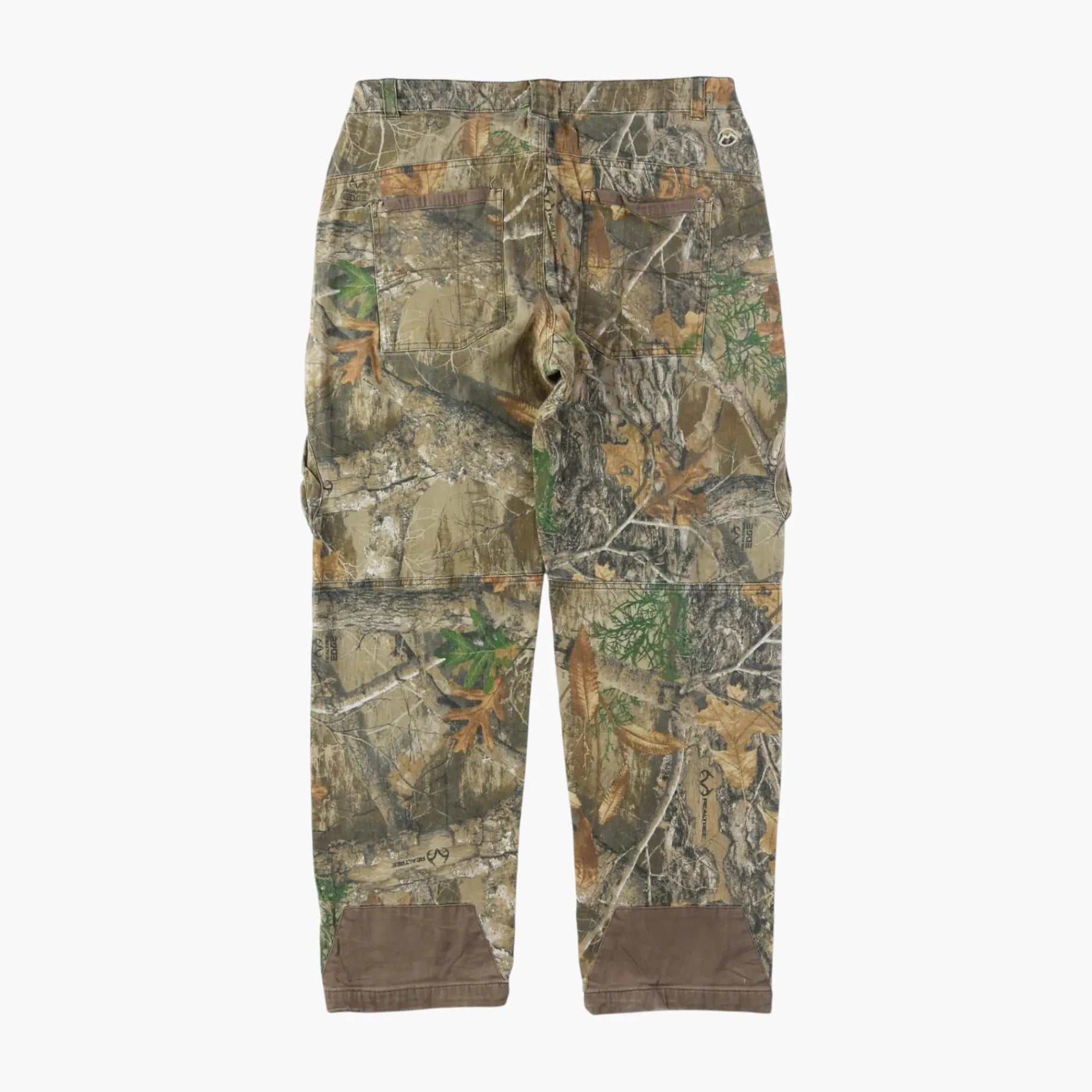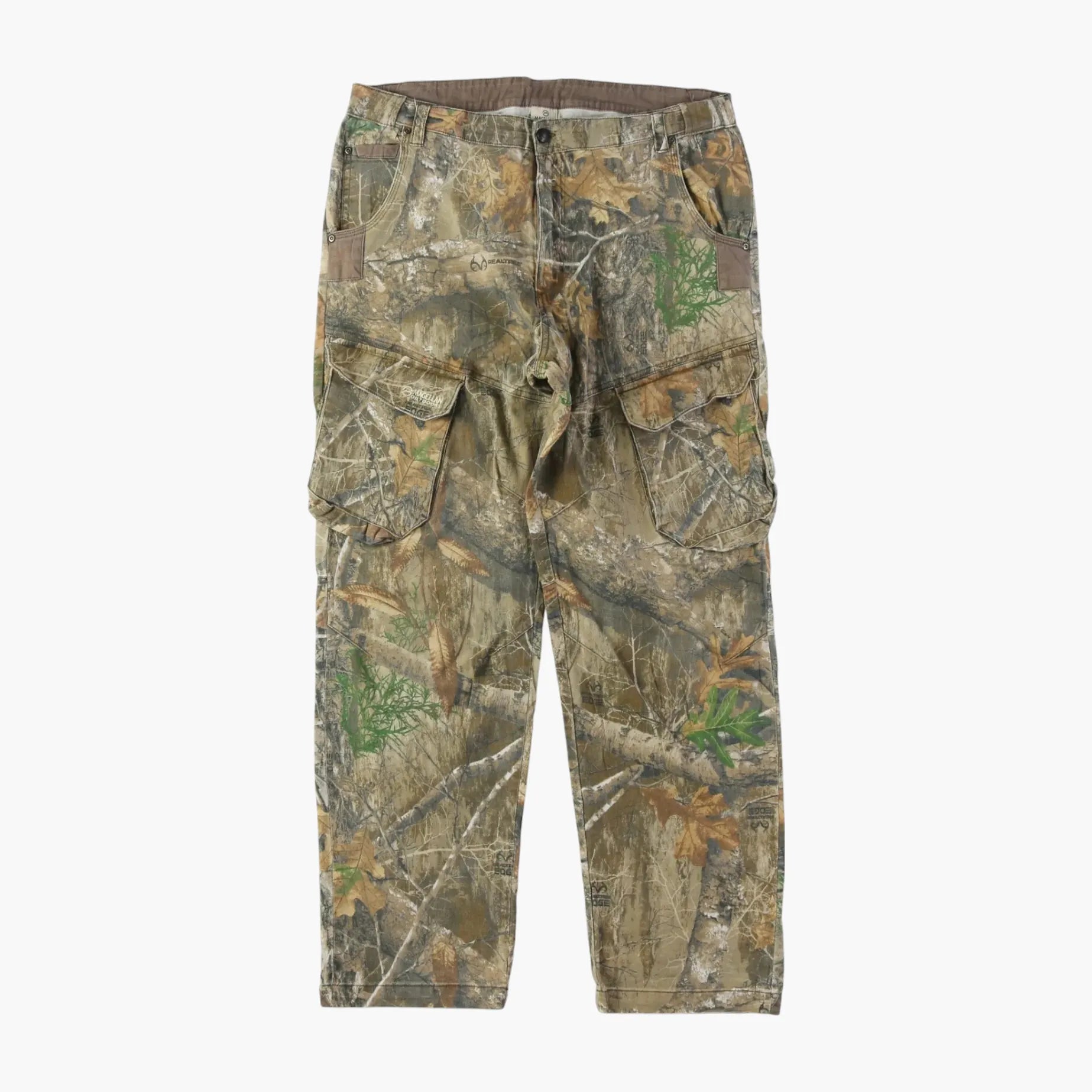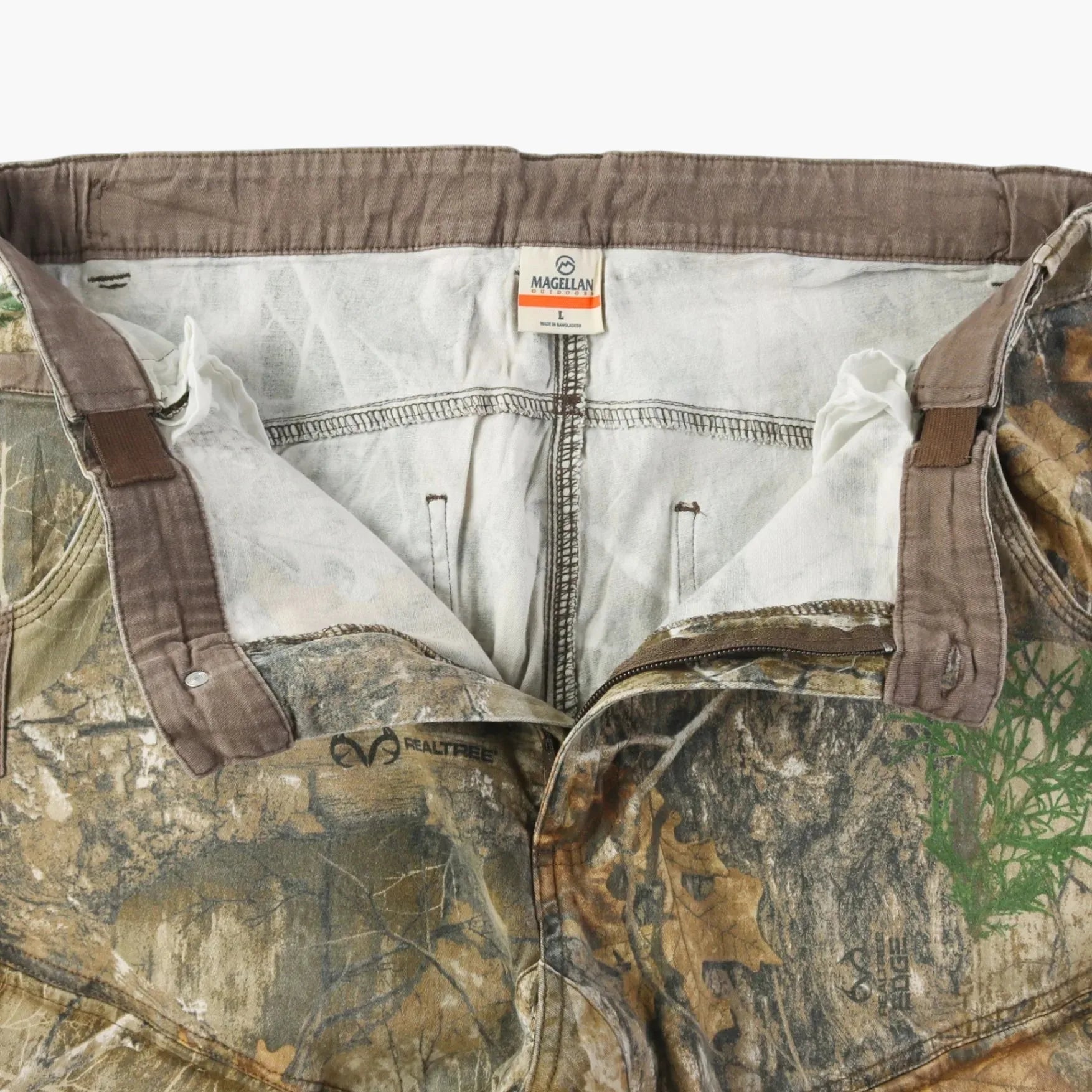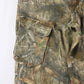 Vintage Magellan Pants in Camouflage. Features forest camouflage print, dual large cargo and side pockets, metal zipper and button closures, and reinforced knees.