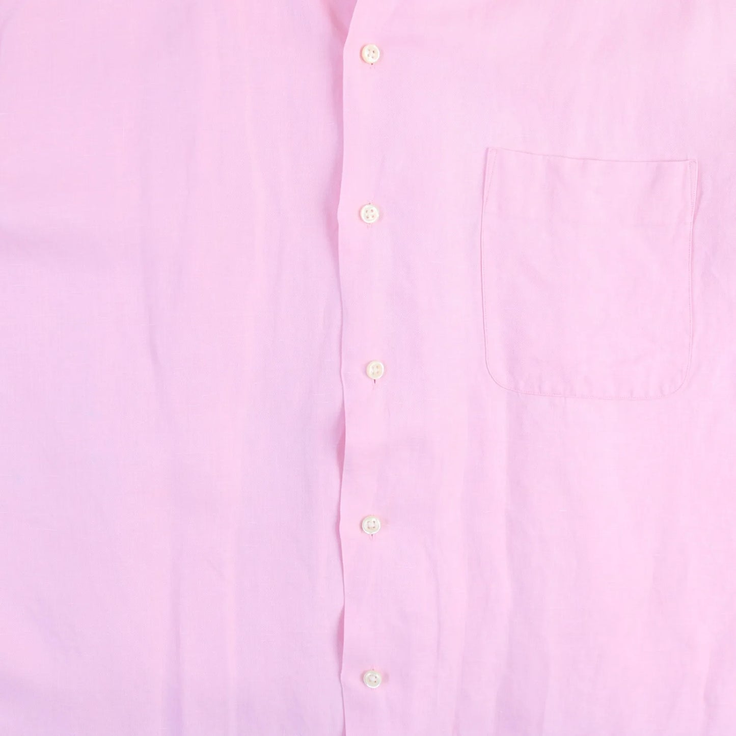 Vintage Ralph Lauren Shirt in Pink. Short-sleeve Polo shirt with a button-down front, a single chest pocket, and a green embroidered pony logo at the bottom left.