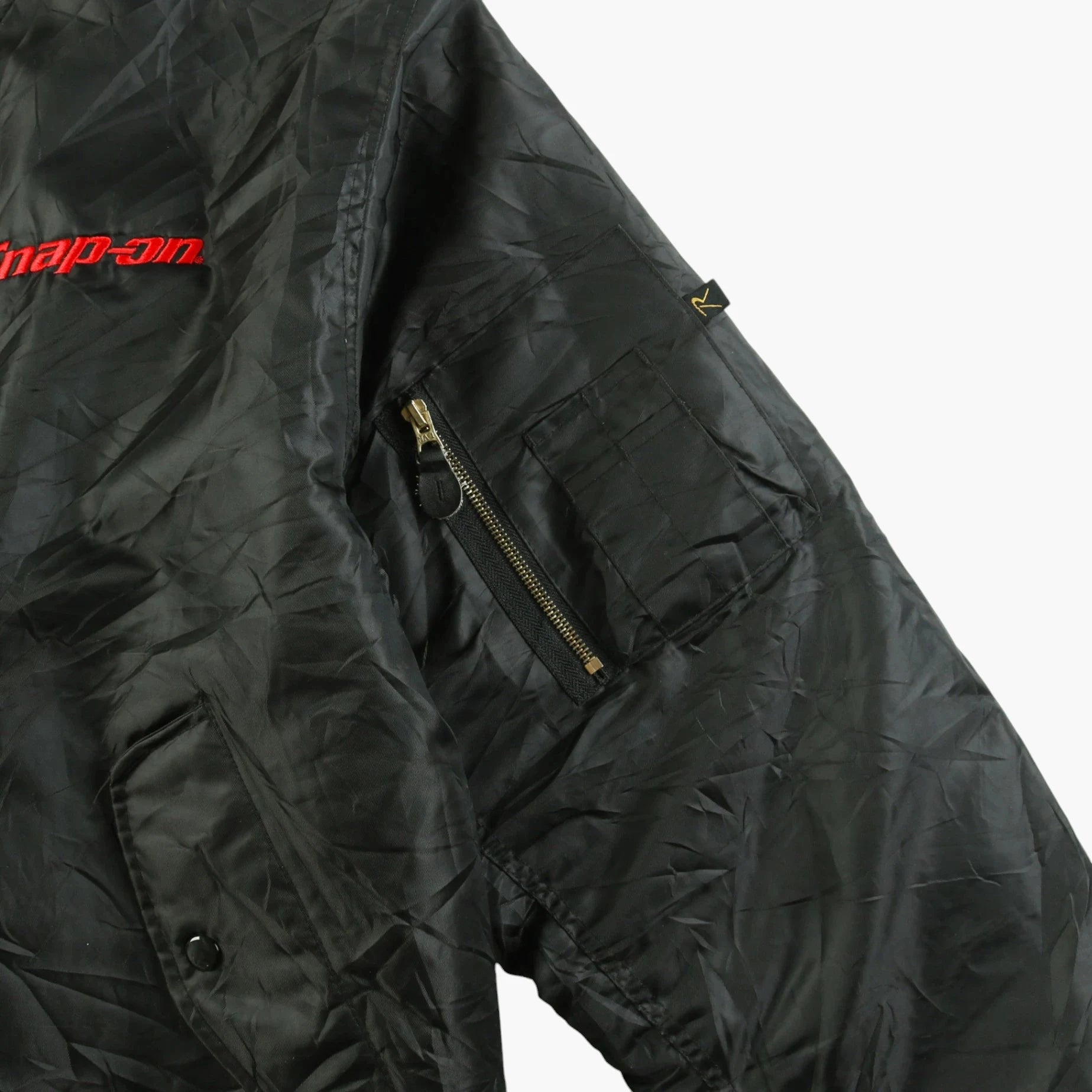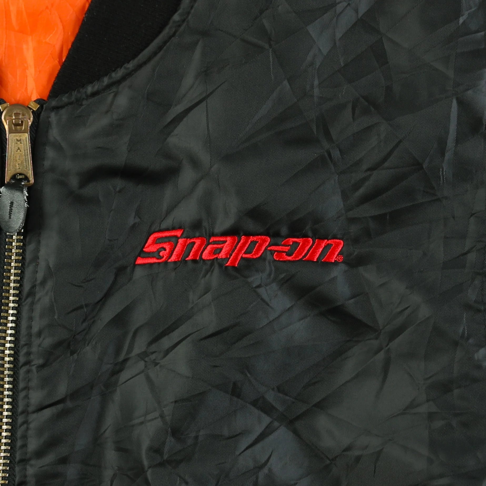 The bomber jacket has a functional yet stylish legacy, originating with military air forces in World War II, designed to keep pilots warm at high altitudes. The black color and straightforward design make this jacket a versatile choice. Snap-on, a well-known tool manufacturer, features branding here, blending utility and occupational identity. Modern enthusiasts appreciate such apparel for its retro appeal and durability. The red embroidery adds a pop of color and brand recognition. This item exemplifies the merging of utility wear and vintage fashion.
