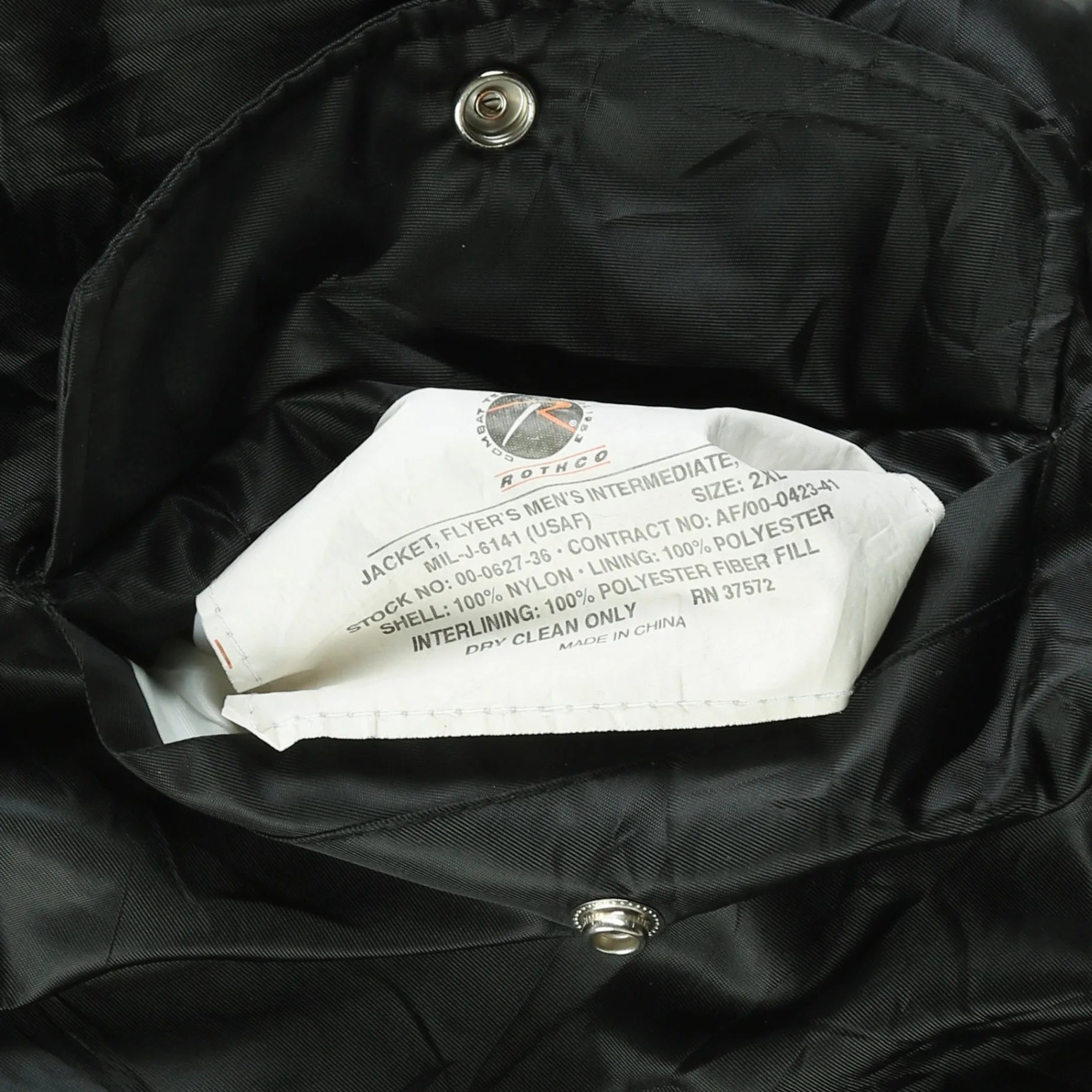 Vintage Bomber jacket in Black. Black bomber jacket with red snap-on embroidery on the chest, brass zip-up closure, orange inner lining, functional pockets with button closures and a sleeve zipper pocket.