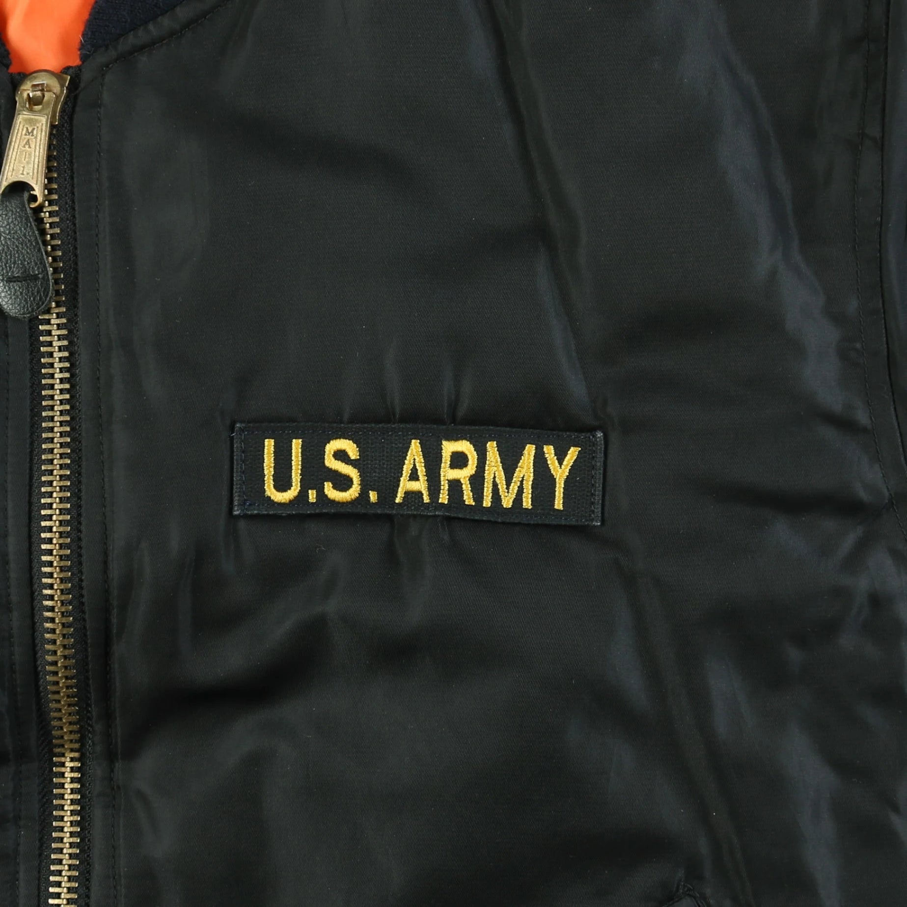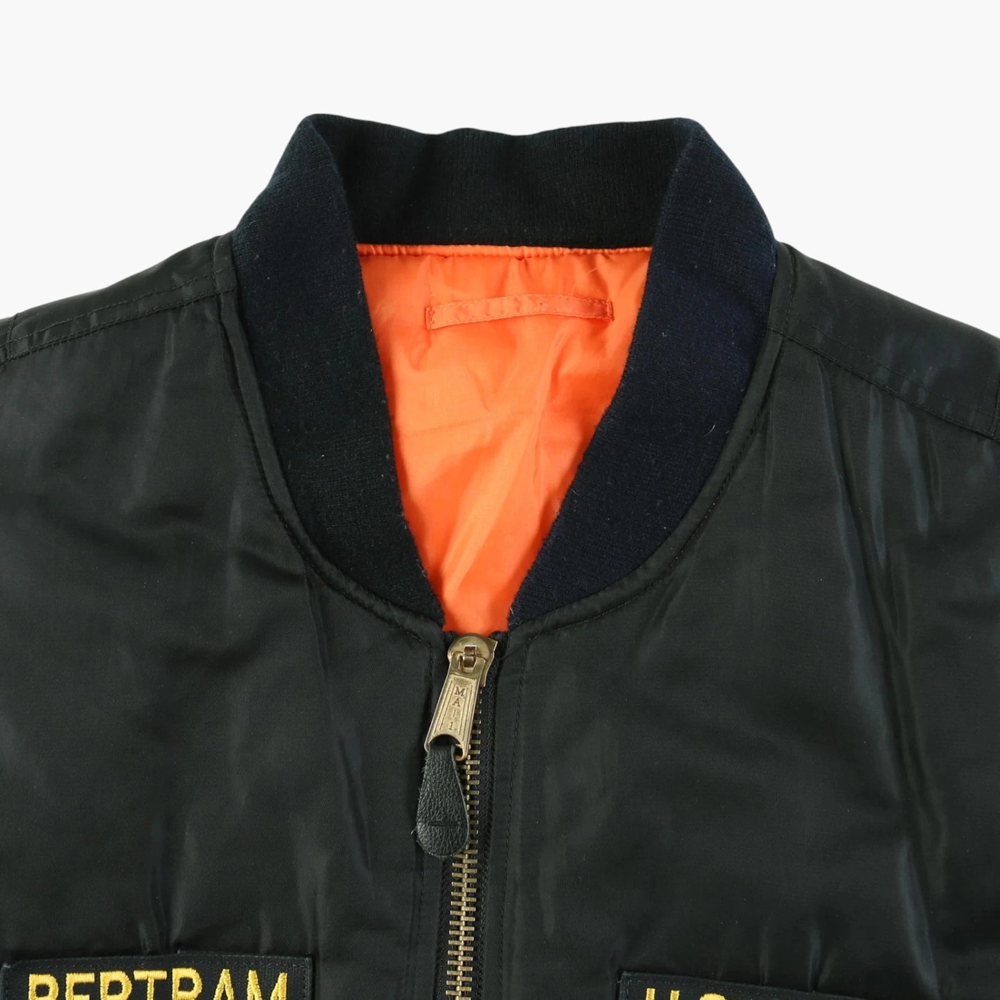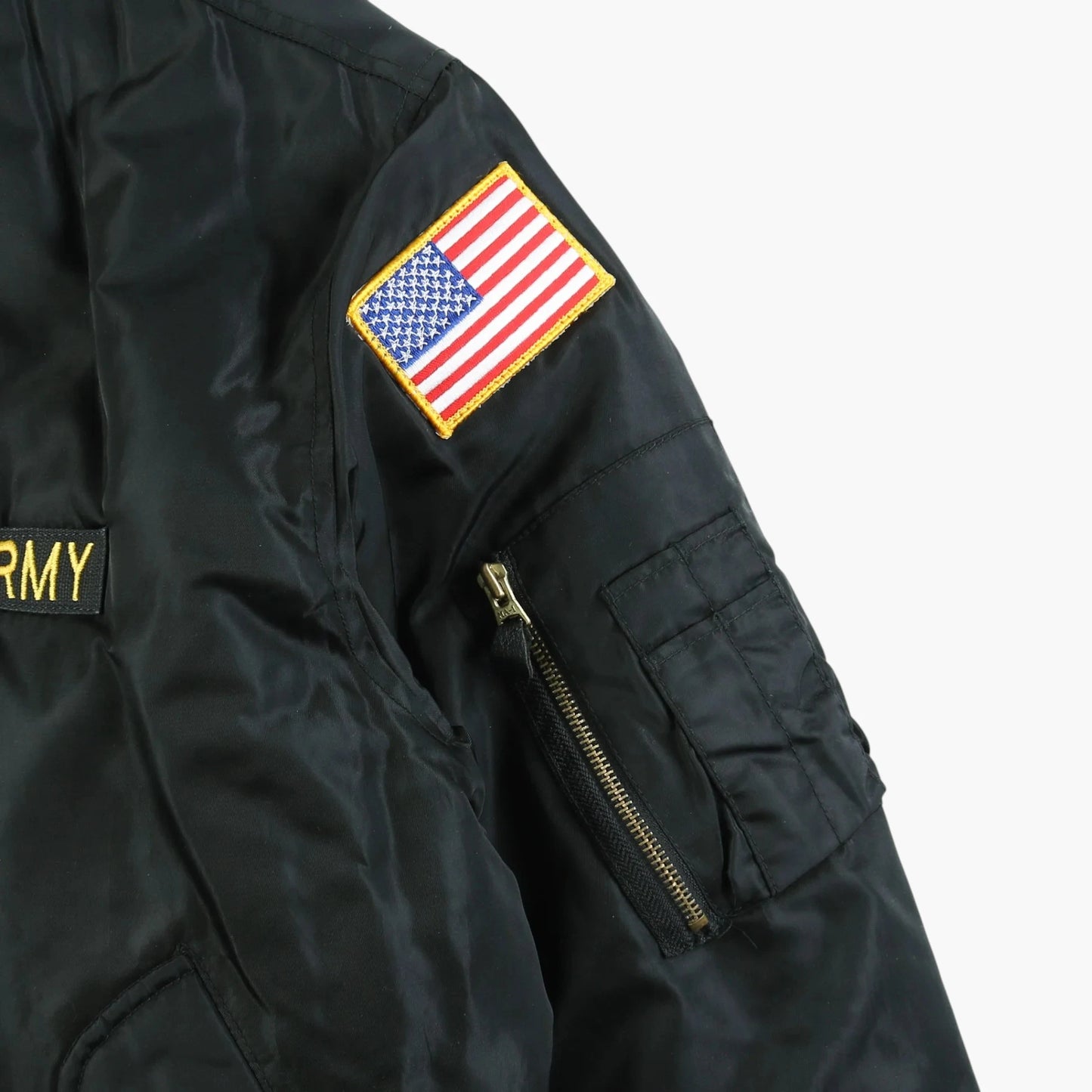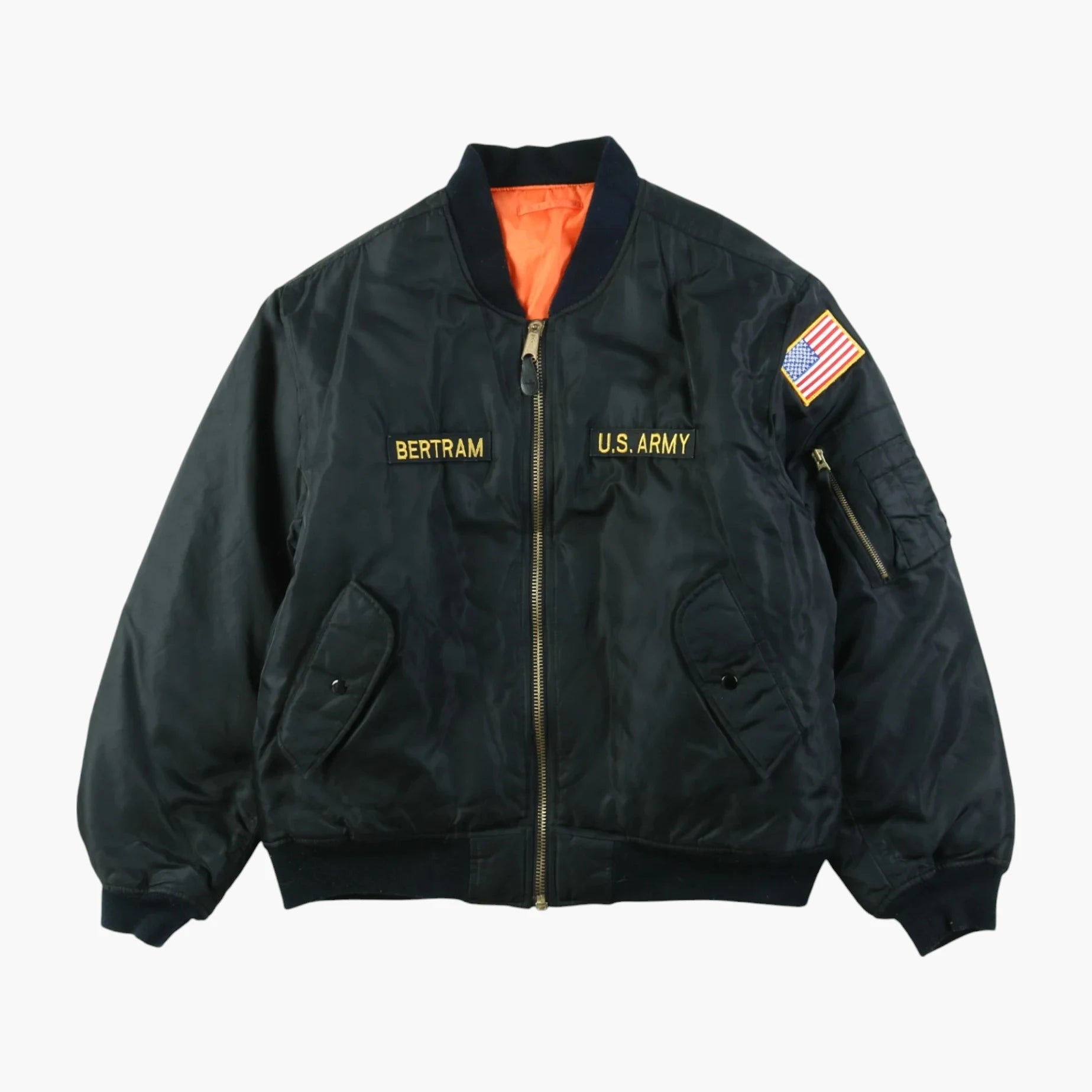 Vintage Bomber Jacket in Black. Black bomber jacket with embroidered 'U.S. Army' and 'Bertram' patches, American flag patch on the sleeve, arm zip pocket, orange interior lining, and durable nylon material.