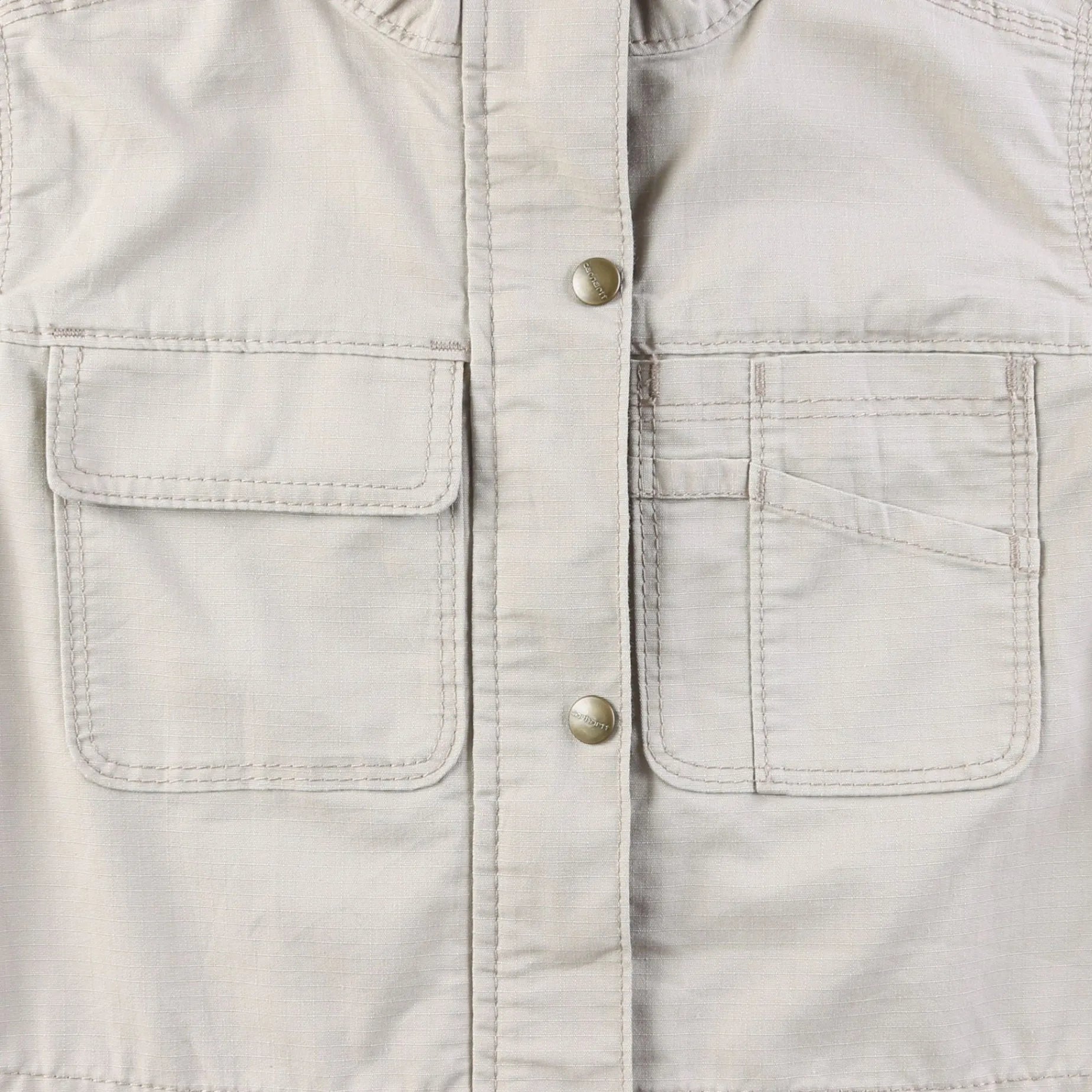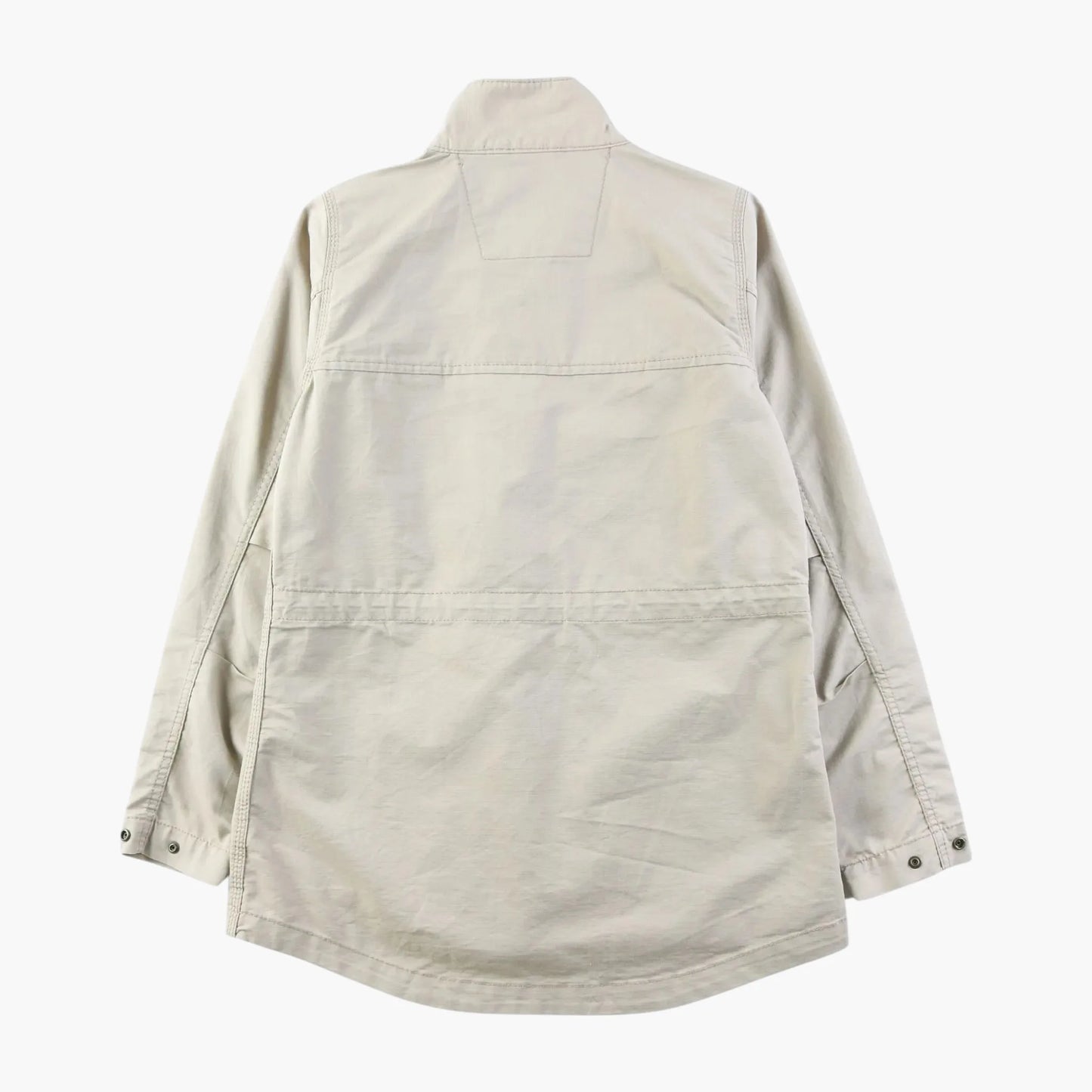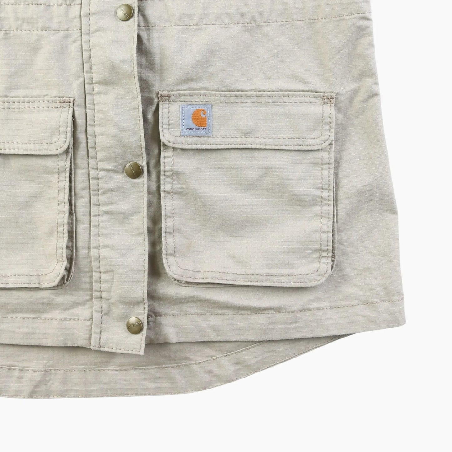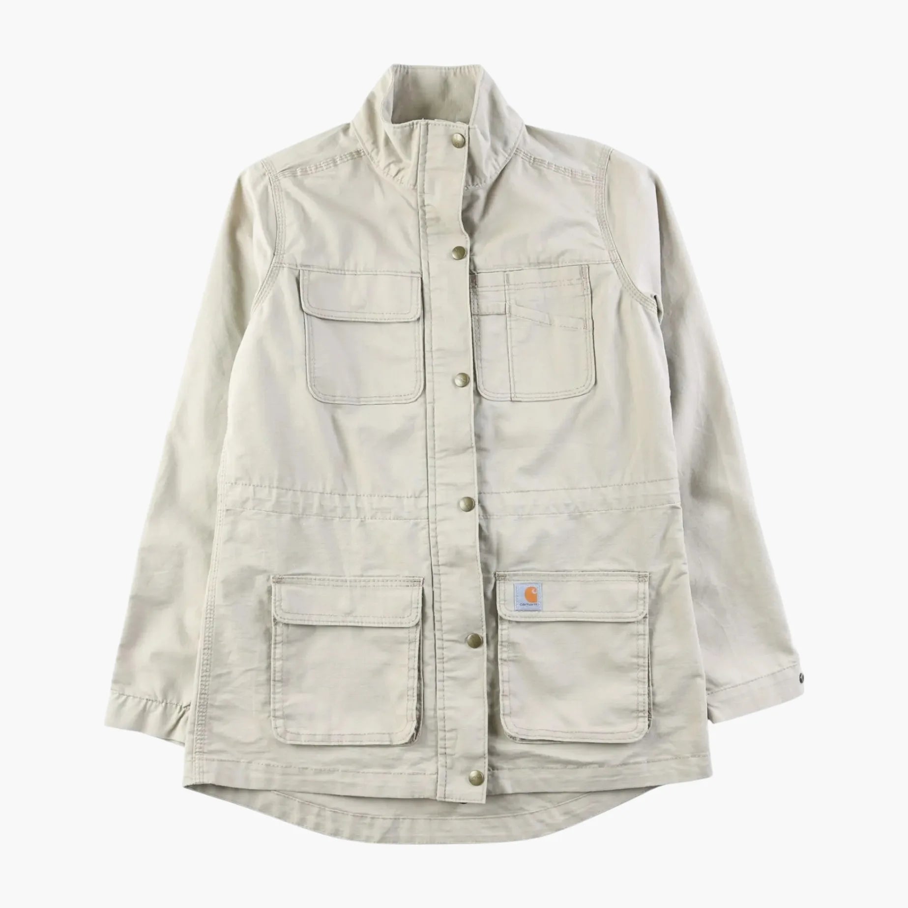 Vintage Carhartt Jacket in Beige. Button and zip closure, multiple pockets, Carhartt branding.