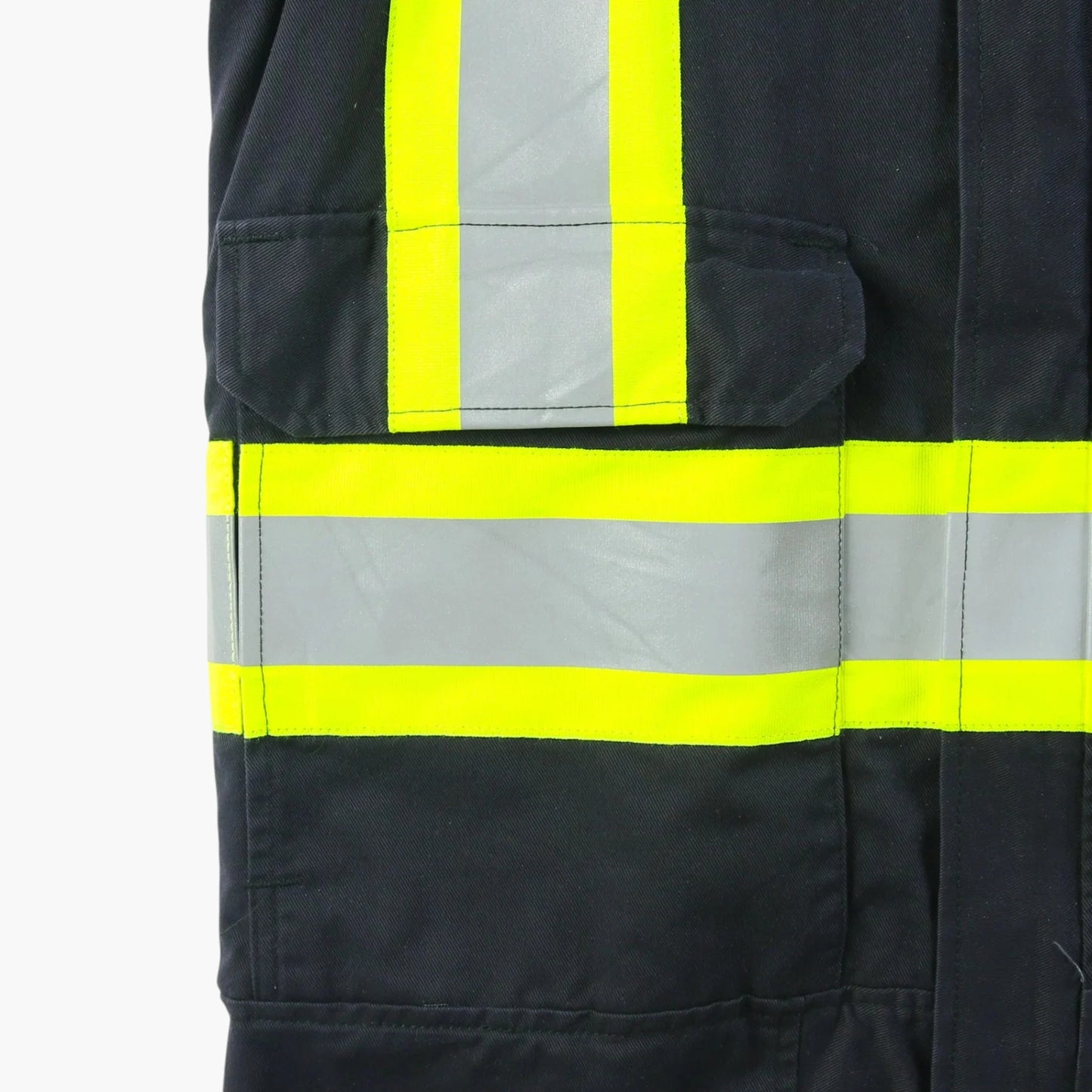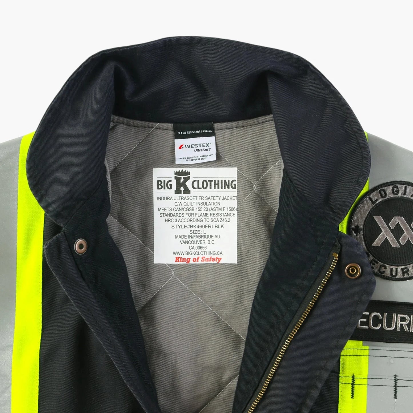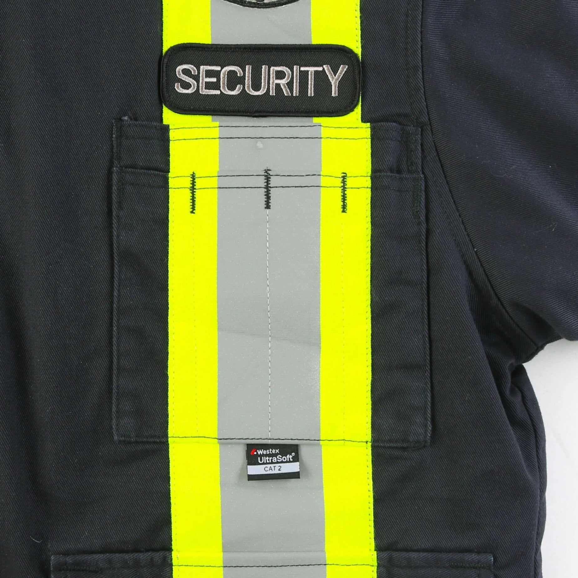 Vintage French Workwear Jacket in Black. Reflective safety striping, 'SECURITY' patches, brand details, and durable fabric.