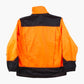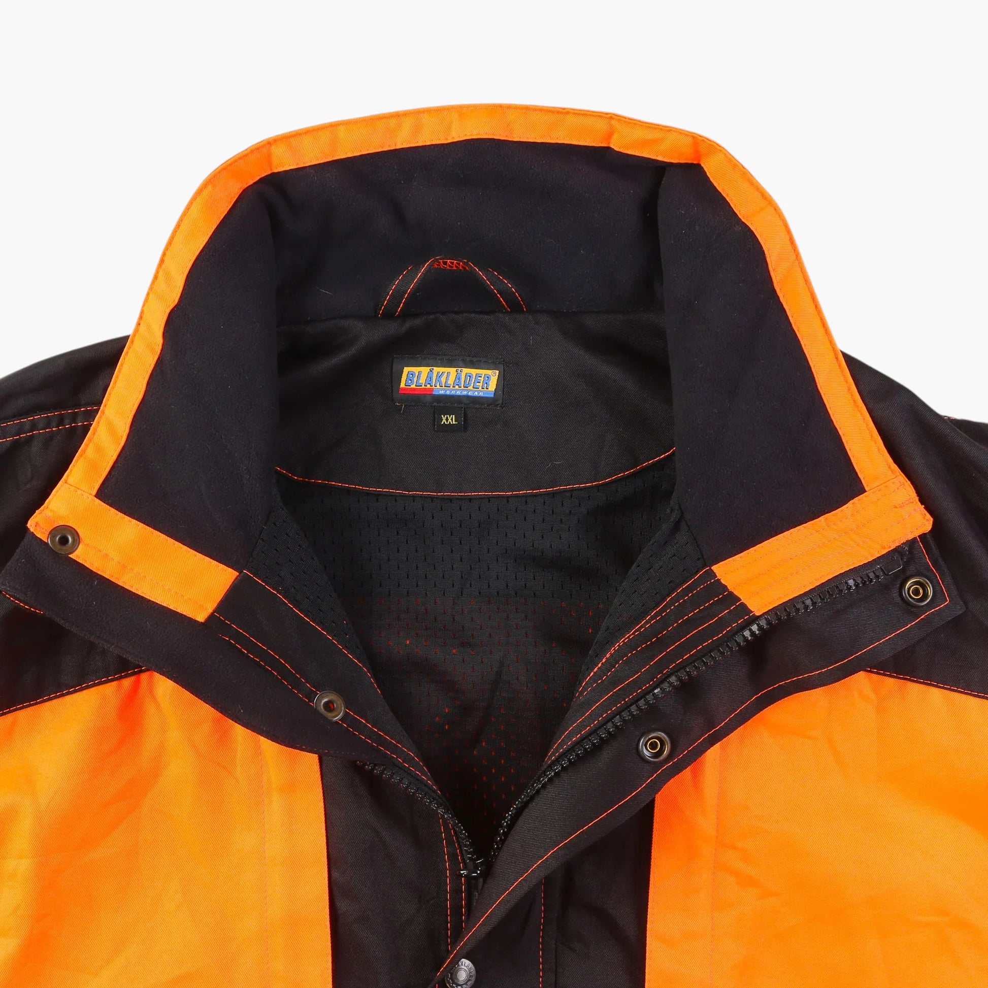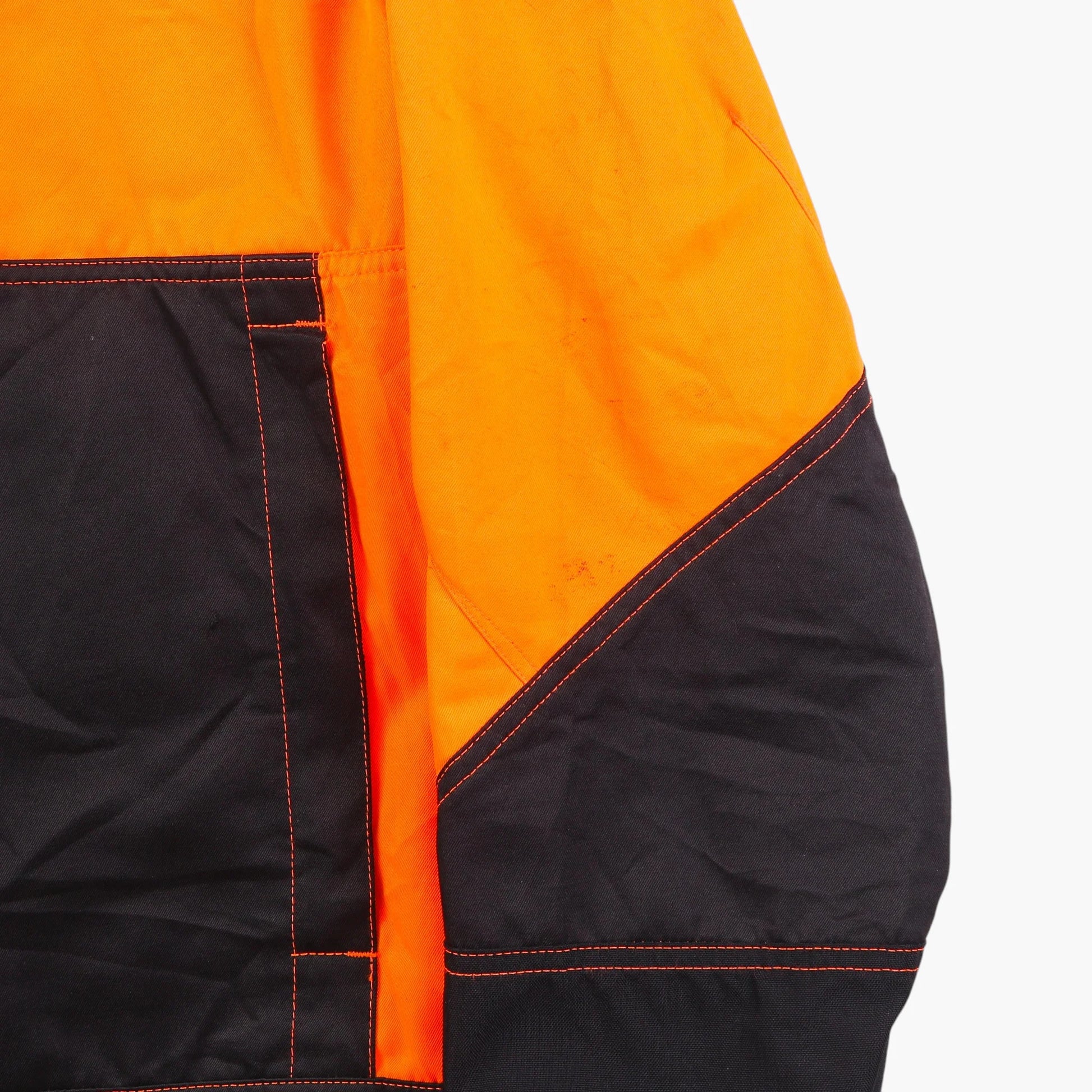 Vintage Workwear Jacket in Black. High-visibility orange and black color block, large dual front pockets, reinforced panels, orange contrast stitching, snap button front, elasticated cuffs, mesh lining, branded Blaklader patch.