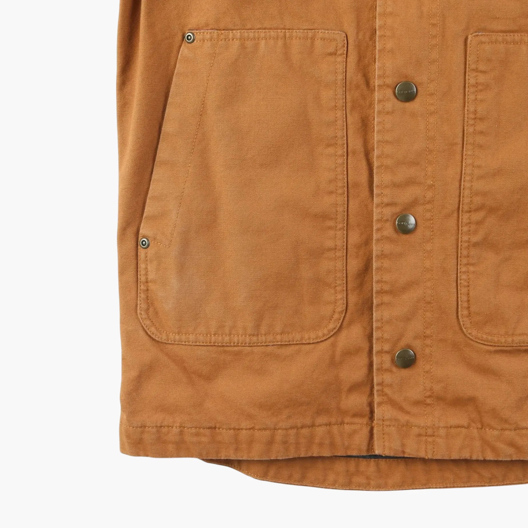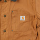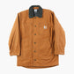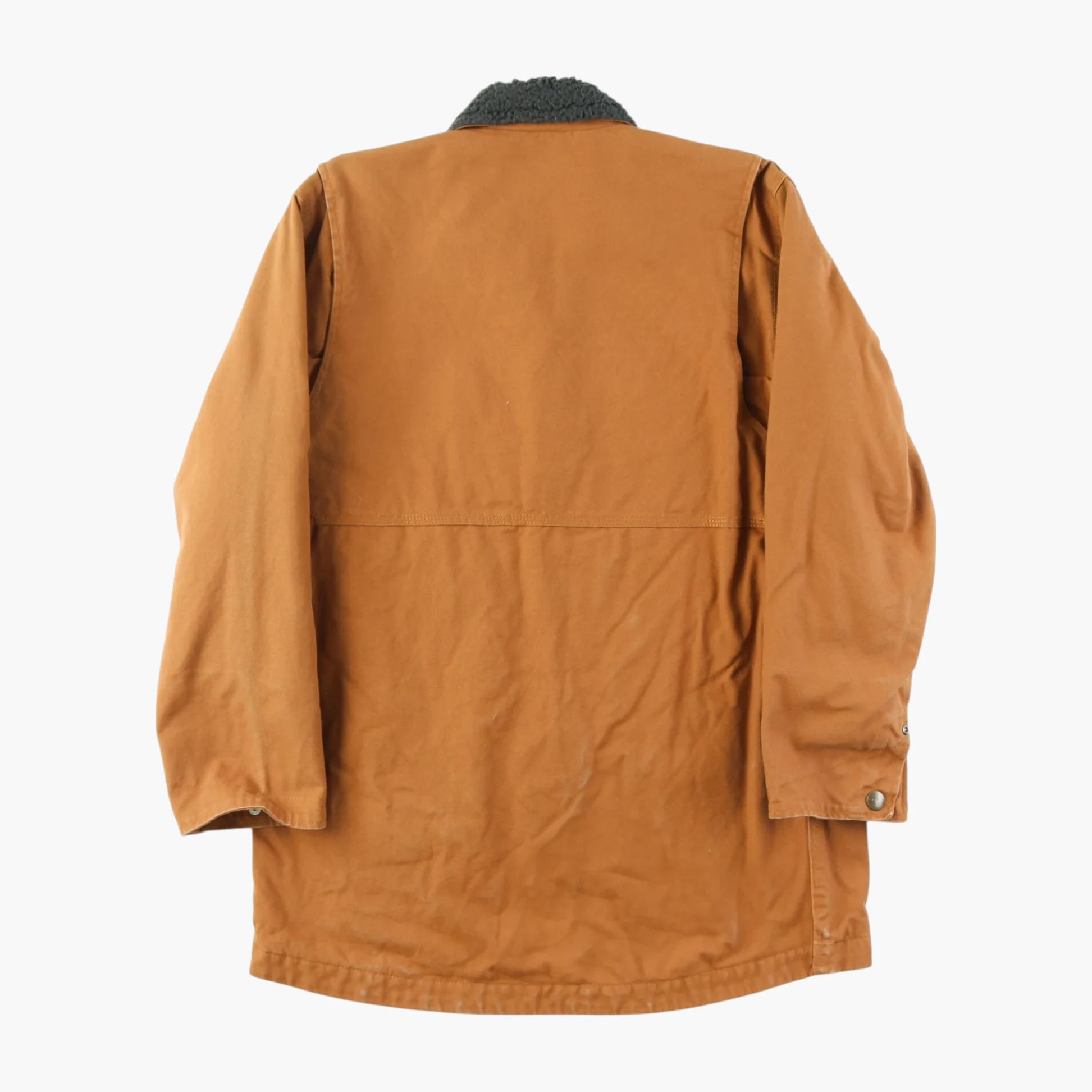 Vintage Carhartt Outdoor Jacket in Hamilton Brown. Heavy-duty cotton canvas, shearling collar, metal-button closure, branded patch, multiple utility pockets.