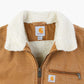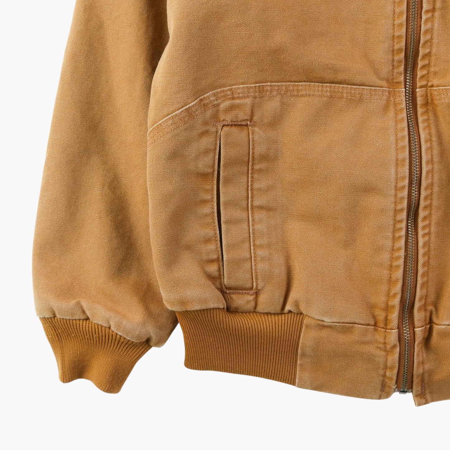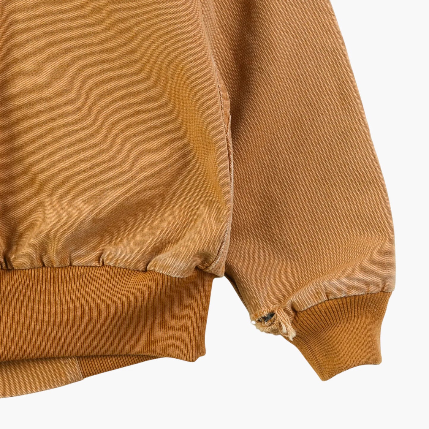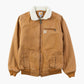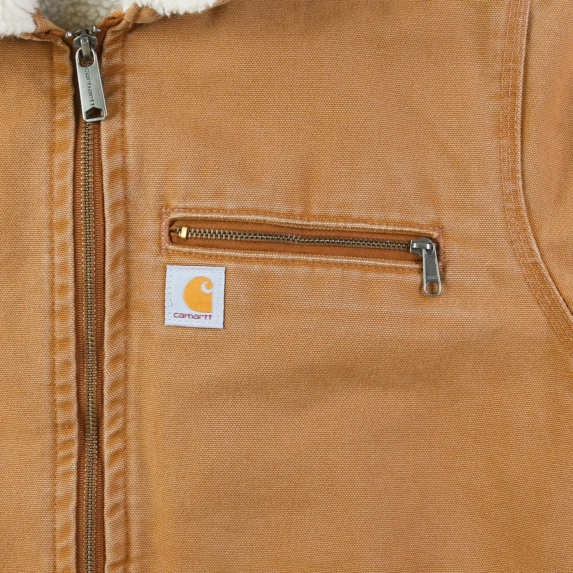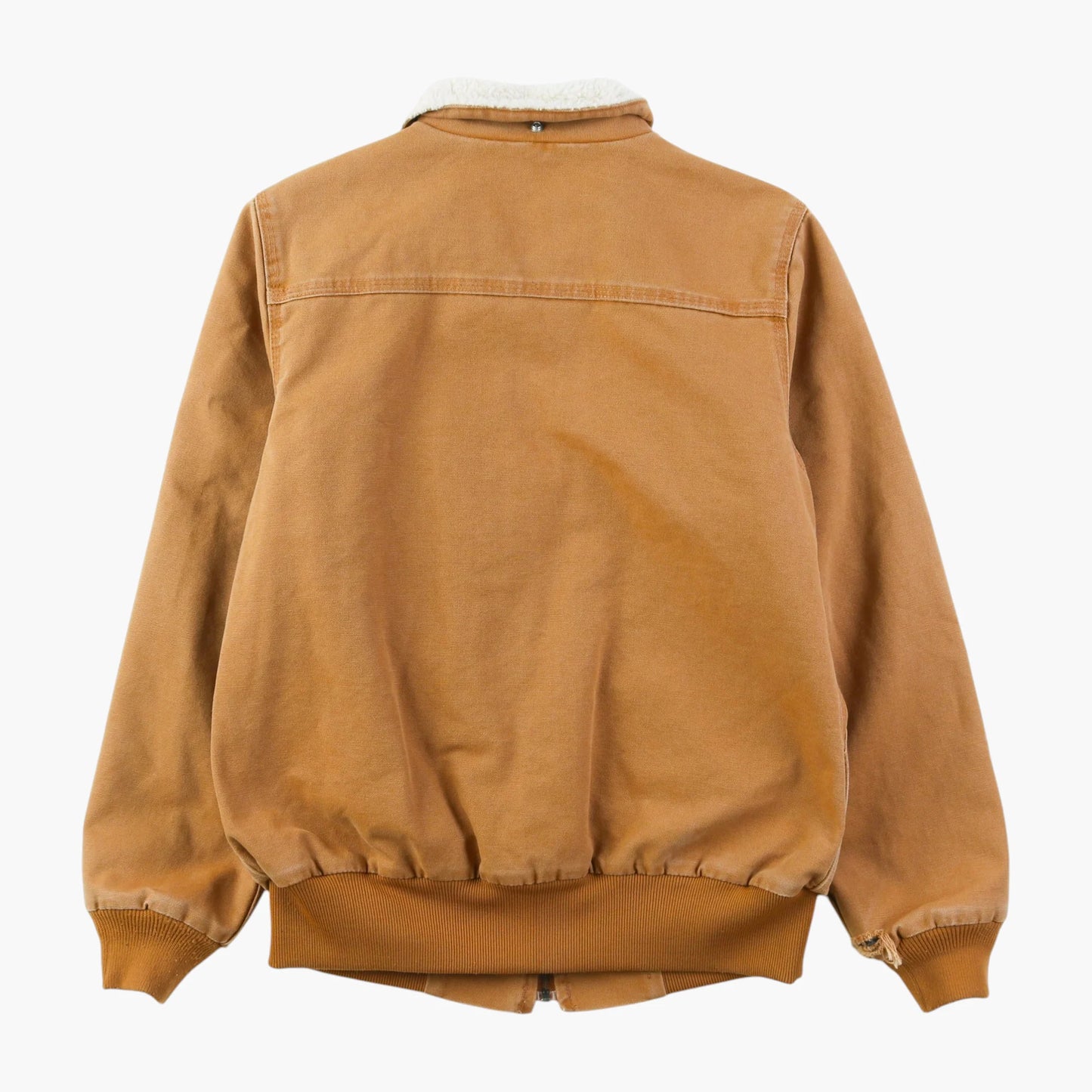 Vintage Carhartt Jacket in Hamilton Brown. Tan-brown canvas work jacket, sherpa fleece collar, Carhartt logo on chest zip pocket, ribbed waistband and cuffs, visible minor distressing at cuff. Heavy-duty cotton outer shell with brass zipper and practical chest and hand pockets.