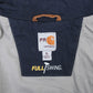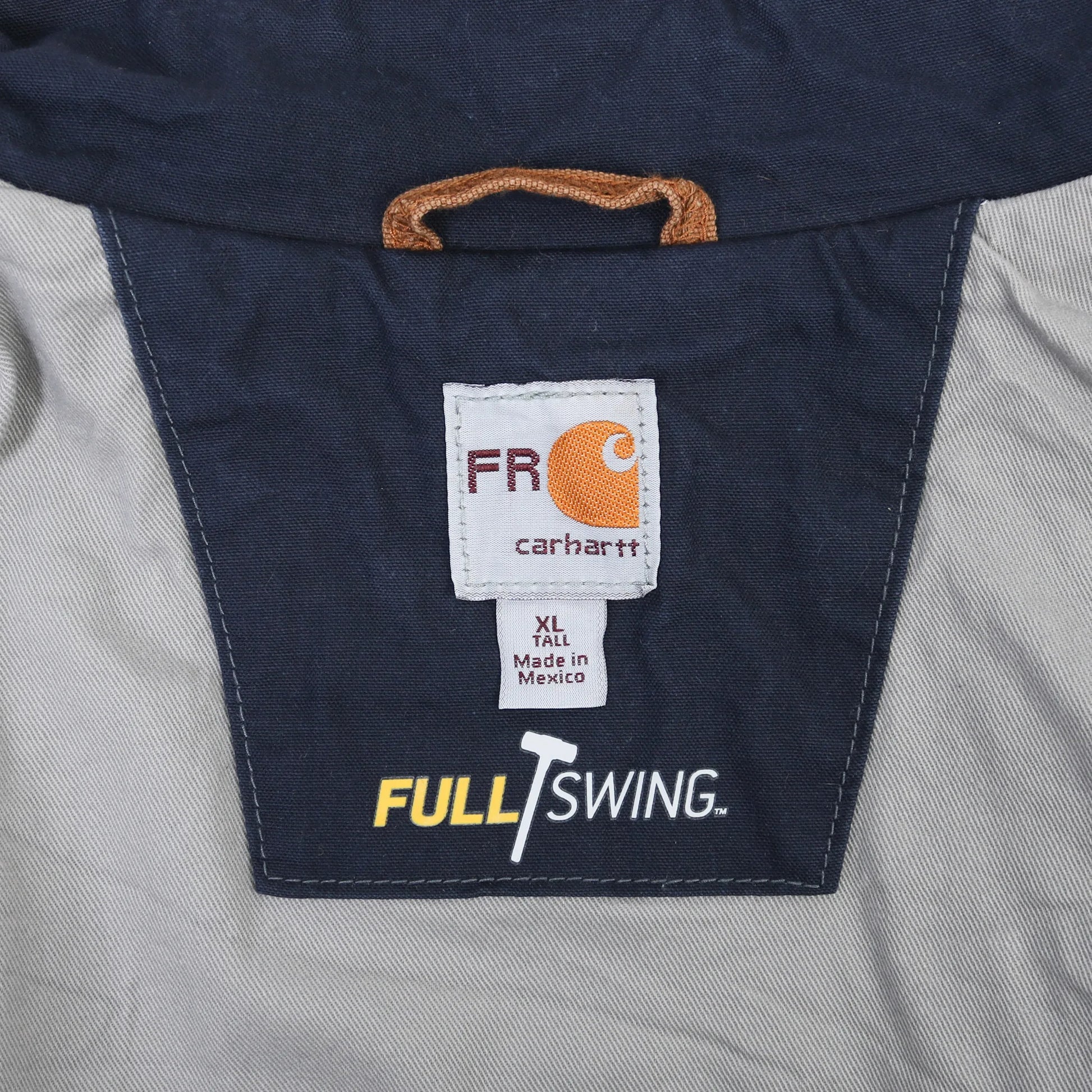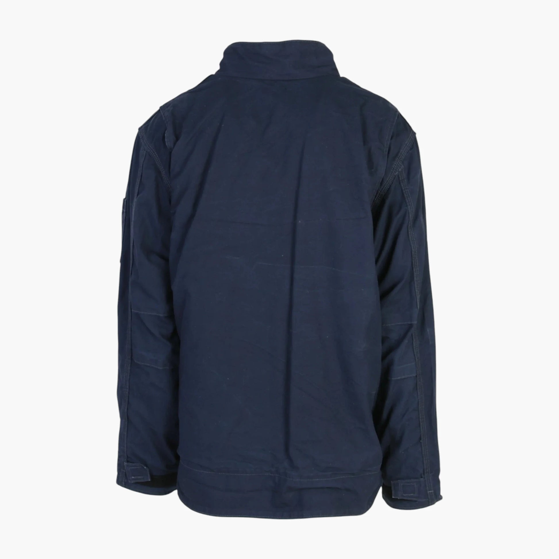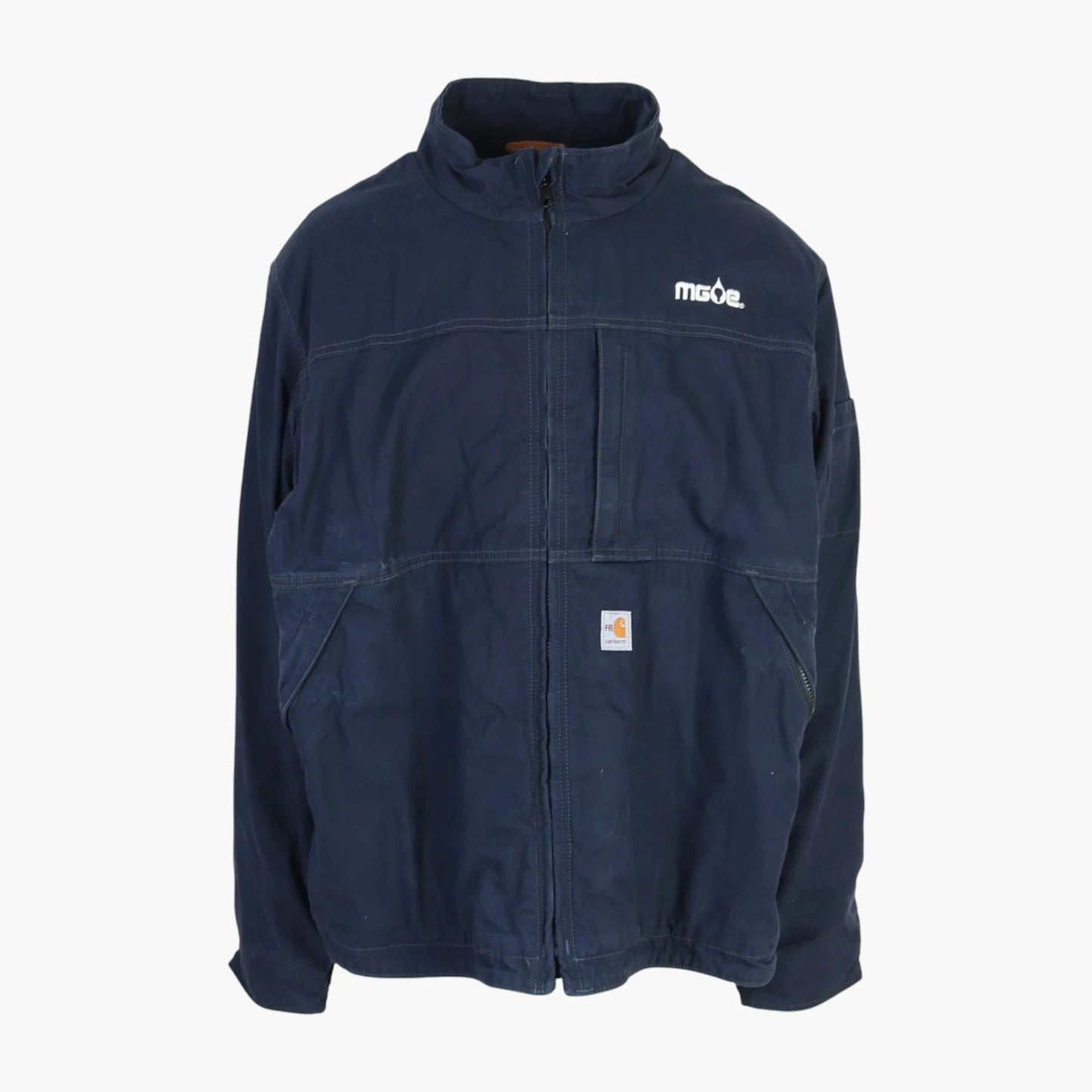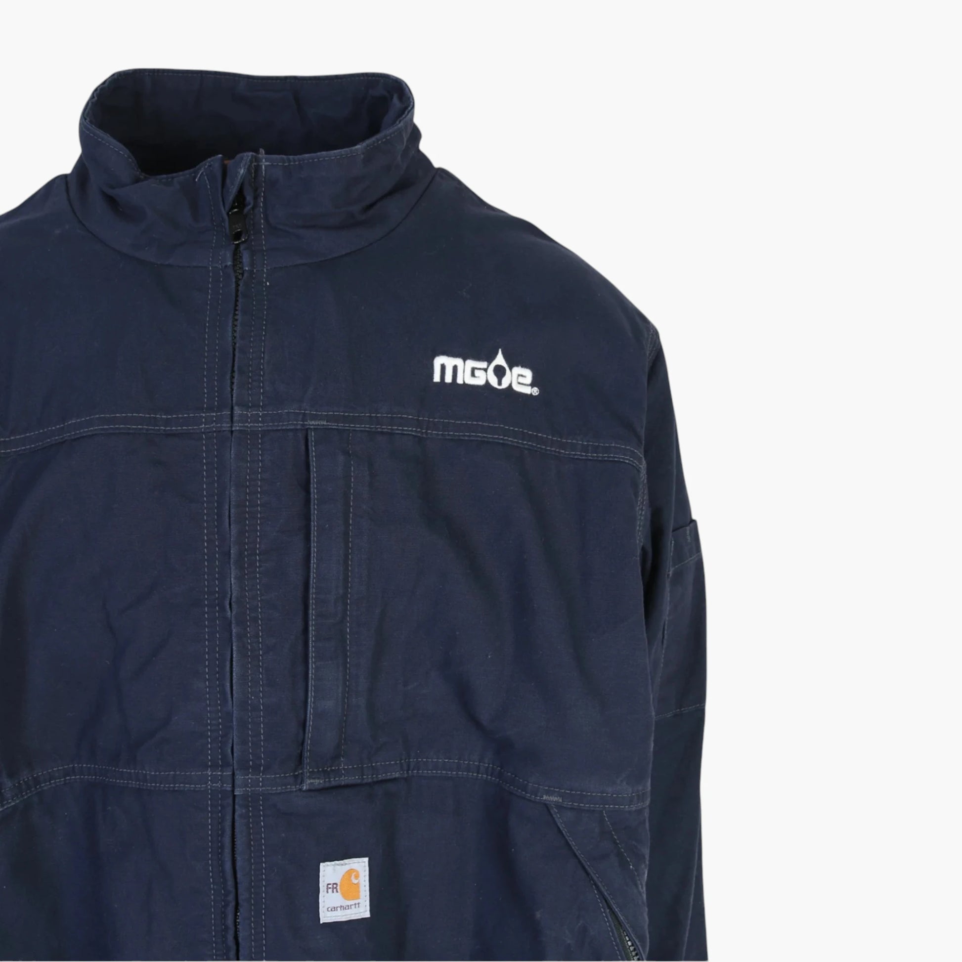 Vintage Carhartt Work Jacket in Navy. Navy work jacket with front zip, high neck, embroidered 'MGOE' logo on chest, Carhartt flame resistant patch, reinforced stitching, and functional utility pockets.