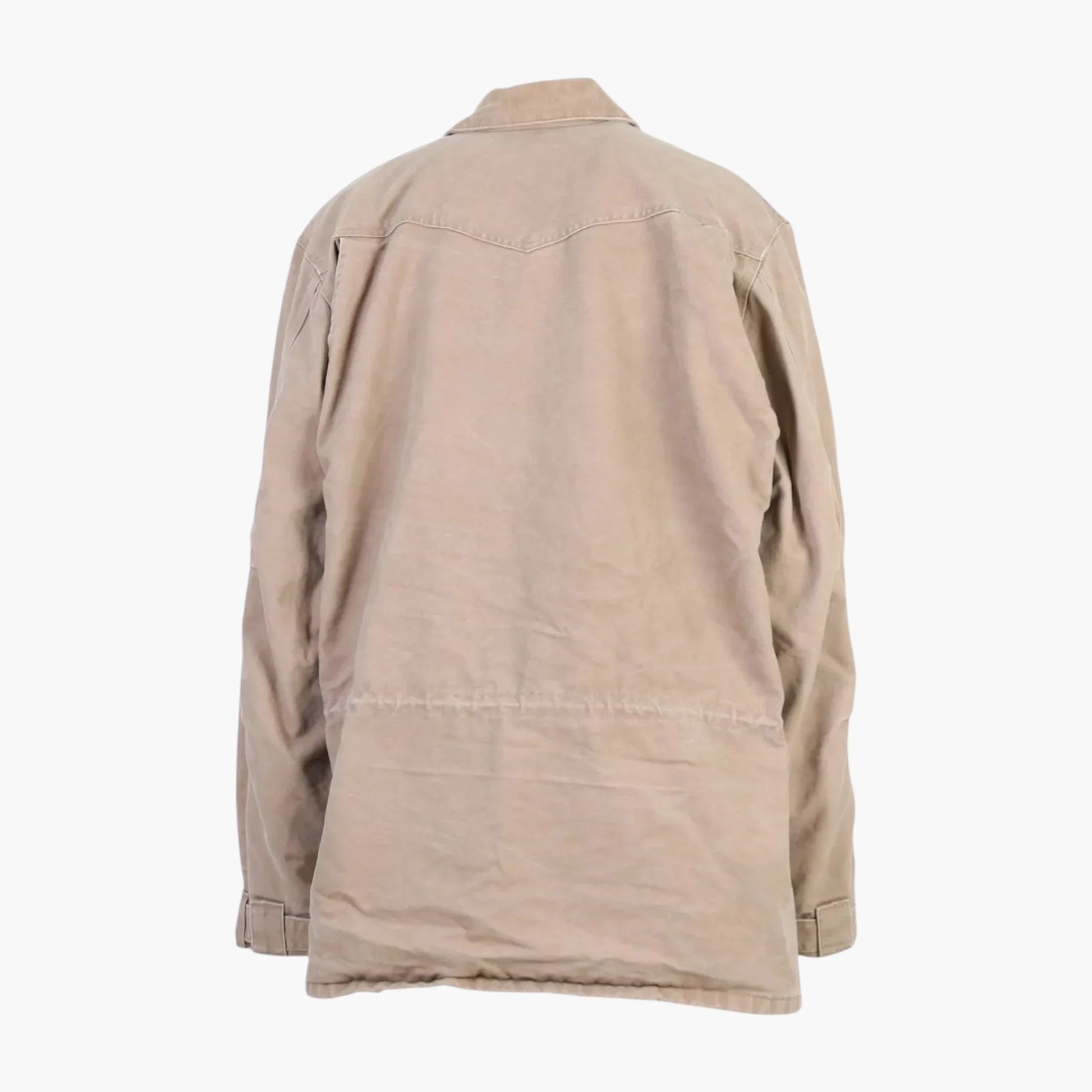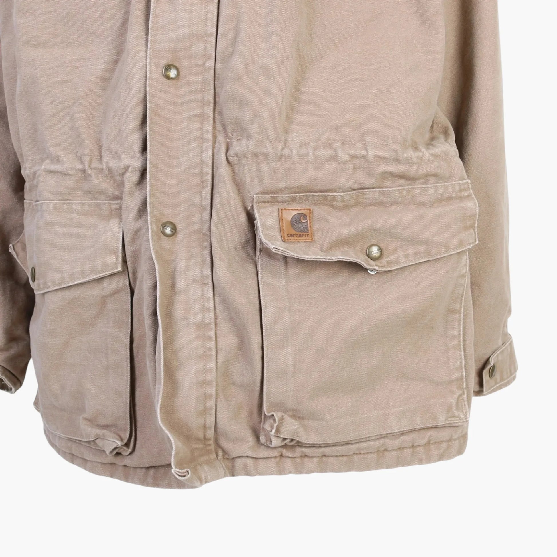Vintage Carhartt Jacket in Stone. Cotton canvas, snap button front, front flap pockets with Carhartt patch, yoke panel detailing, adjustable drawstring hem, reinforced seams.