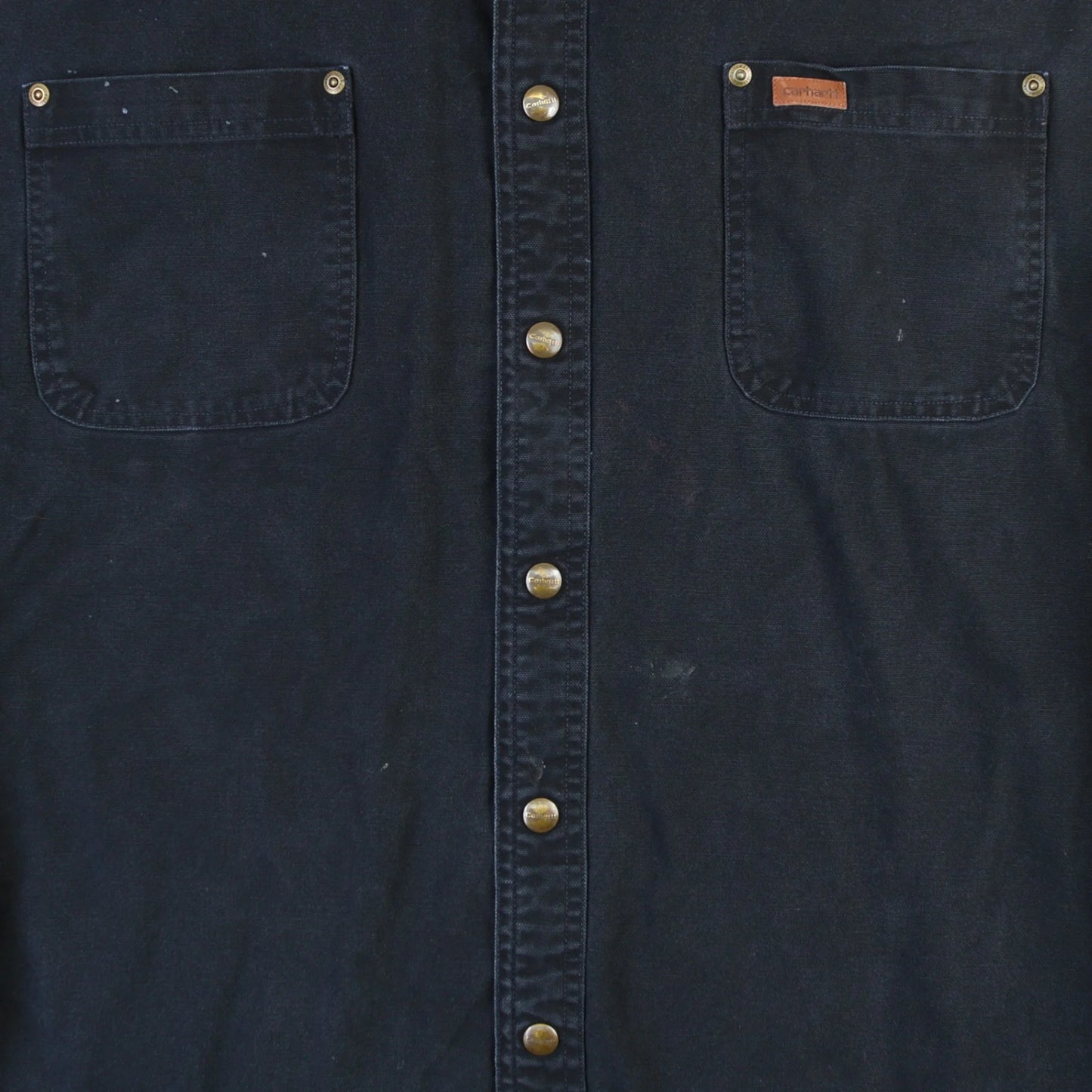 Vintage Carhartt Shirt in Black. Features a soft interior plaid flannel lining, brass snap buttons, and dual chest pockets with a Carhartt label. Minor wear visible, adding to its vintage charm.